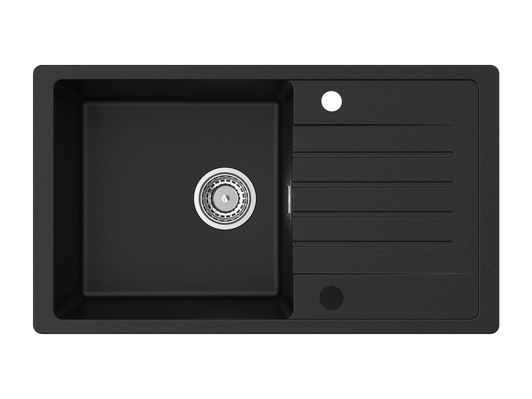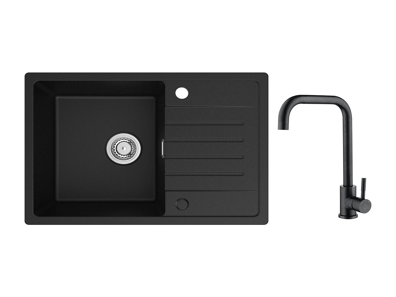 Lavello 1 Vasca in Quarzo e Resina - Nero Lavello con Gocciolatoio 78x45cm + Miscelatore con Doccia Estraibile, Nero