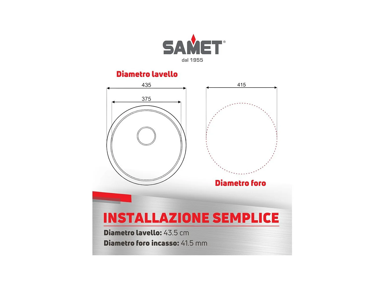 Samet, Lavello Cucina 1 Vasca 43,5x17 cm a Incasso, Modello Rondò EC192 a Pozzetto in Acciaio Inox Satinato