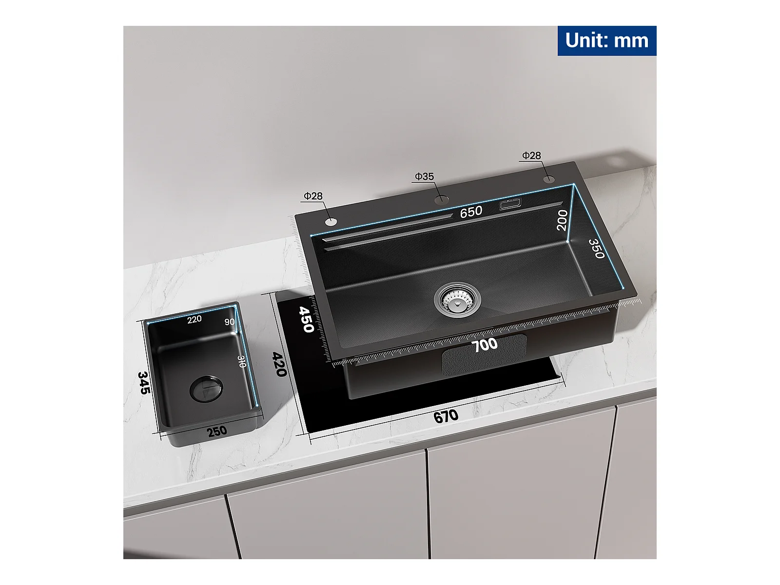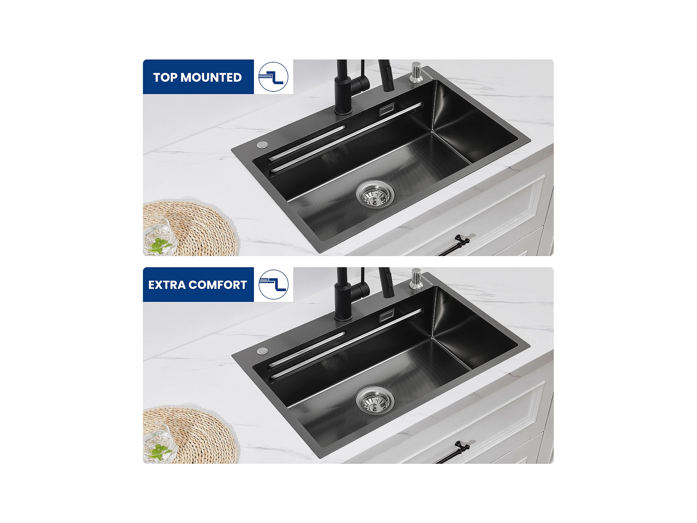 Lavello Cecipa max 1 vasca 70×45×21,5CM Nero con gocciolatoio, vasca e dispenser sapone + Miscelatore cucina con doccetta estraibile Nero