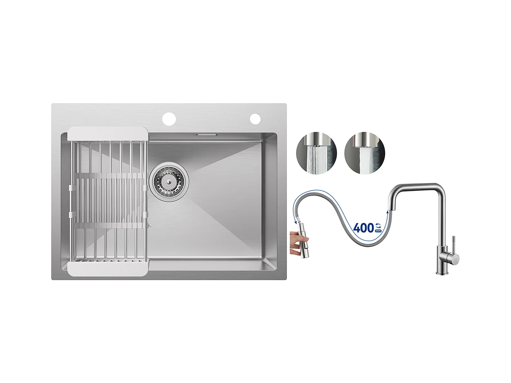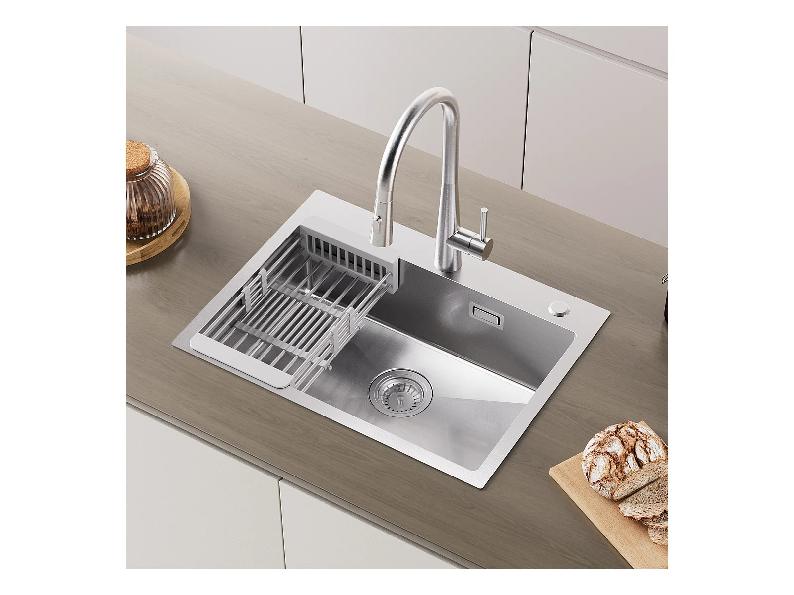Lavello da cucina a 1 vasca 60×45×18 cm Lavello in acciaio inossidabile spazzolato con cestello di drenaggio + Miscelatore da cucina pieghevole spazzolato