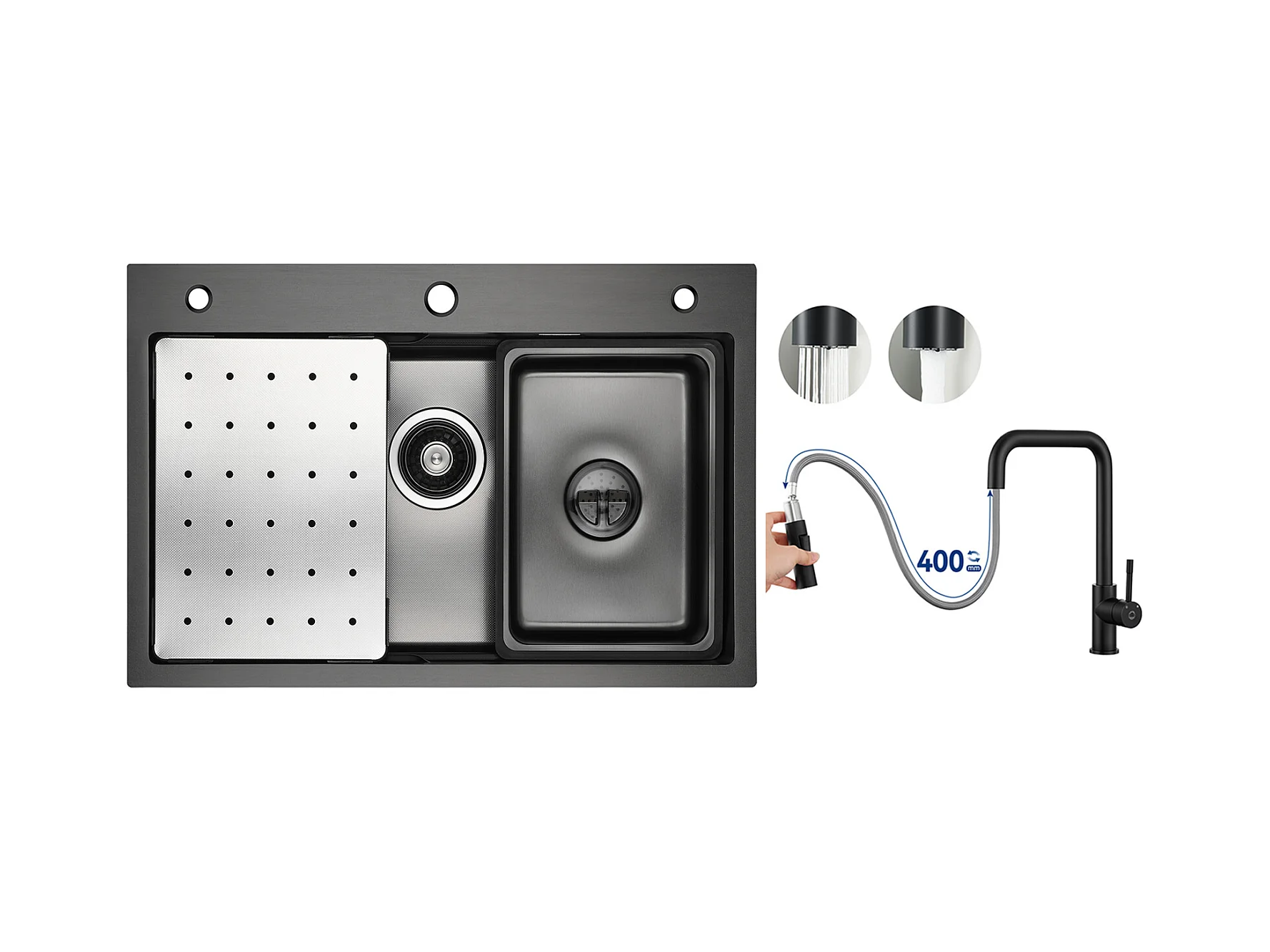 Lavello Cucina 1 Vasca 70×45cm + Gocciolatoio + Vaschetta + Dosatore Sapone + Miscelatore Lavello Nero Girevole 360°