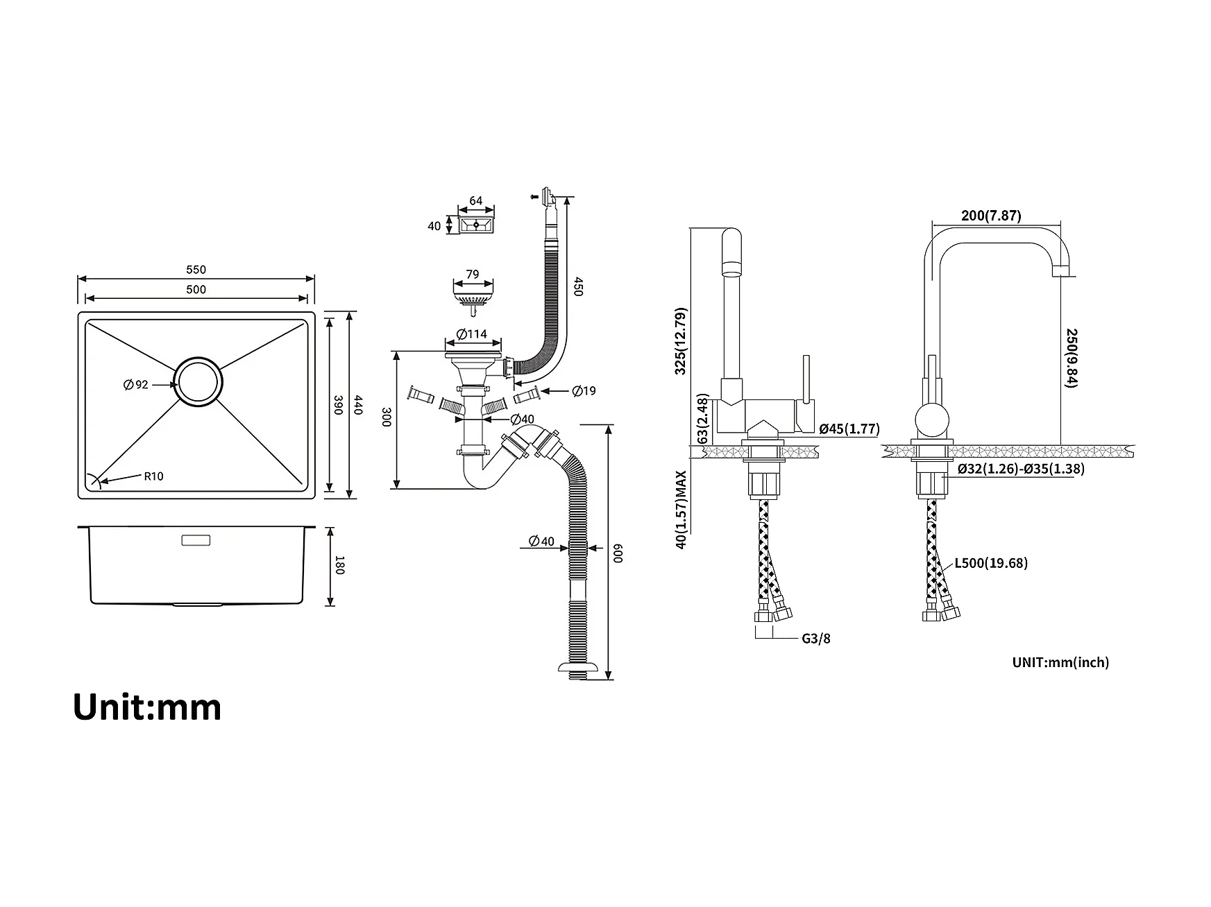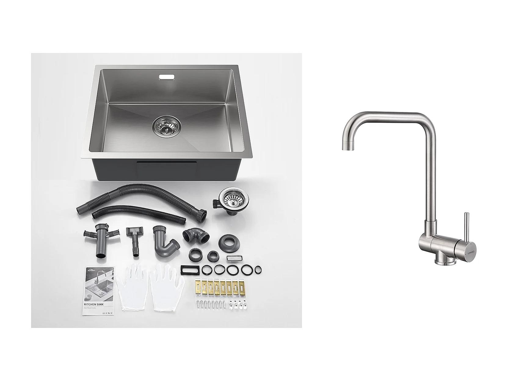 2 in1 Lavello da Cucina 1 vasca 55*44*19CM, da incasso/fiore/sottopiano, Spazzolato +rubinetto da cucina retrattile a due funzioni, cromato