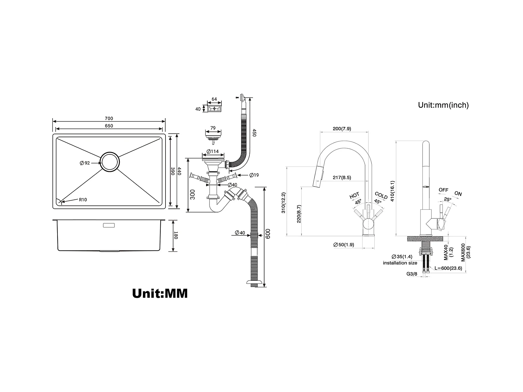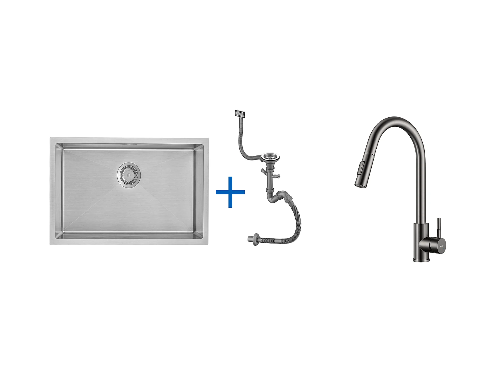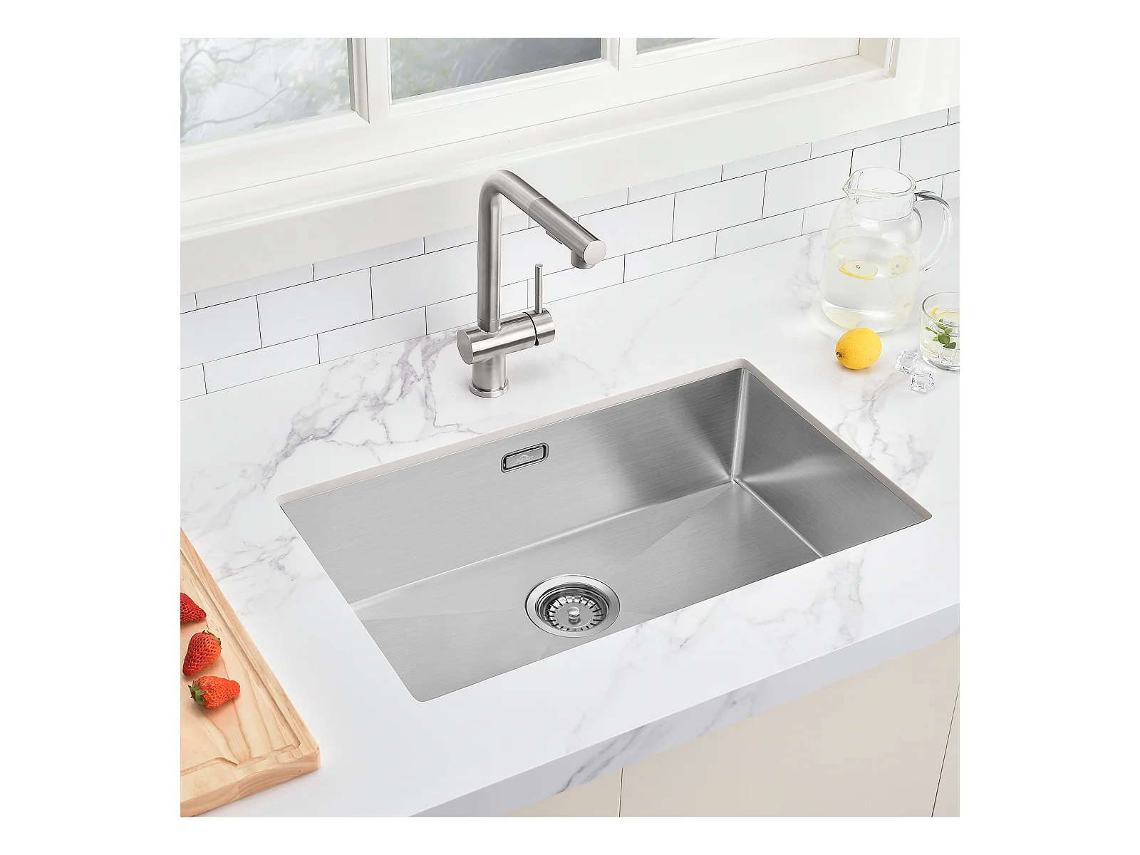 Lavello Cucina 1 vasca 70*44*19CM,da incasso/fiore/sottopiano,con sifone/troppo pieno,spazzolato + rubinetto da cucina inox estraibile rotante