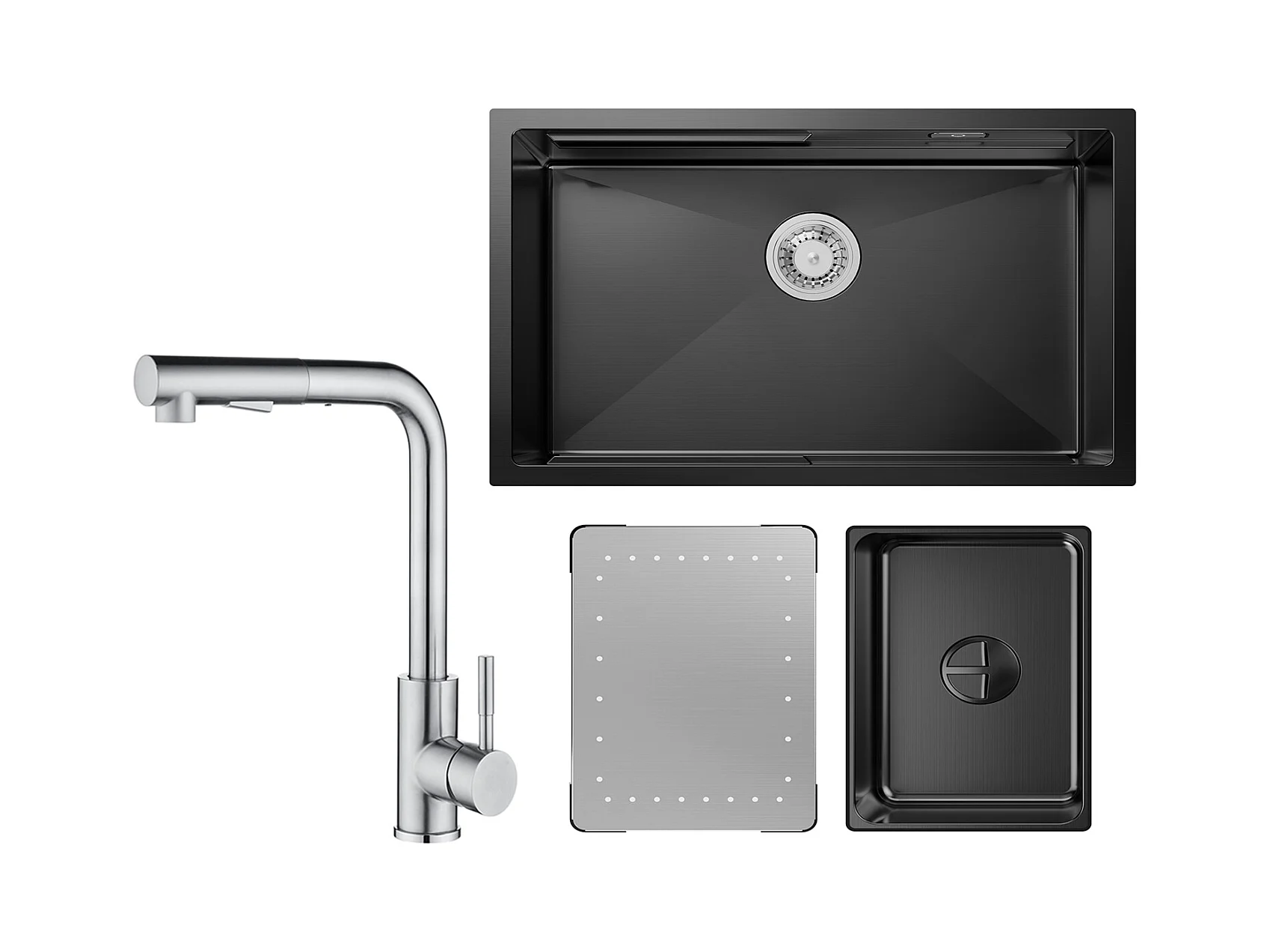 Lavello Cucina 1 Vasca 70×44×21CM Lavello Inox Nero con Gocciolatoio e Vaschetta + Miscelatore con Doccetta Estraibile, Nero