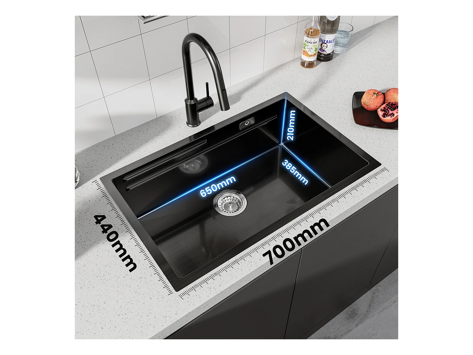 Lavello Cucina Cecipa max 1 Vasca 70×44×21CM Nero Lavello Incasso con Gocciolatoio e Vasca + Miscelatore Cucina Spazzolato con Doccetta Estraibile