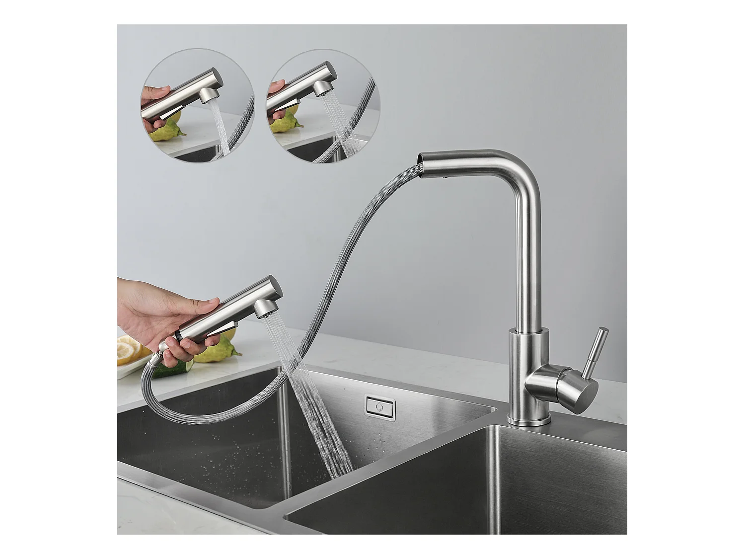 Cecipa max Miscelatore Cucina a Parete Spazzolato, Rubinetto Lavabo a Parete con 2 Getti, Miscelatore Cucina Girevole a 360°, Modello EU