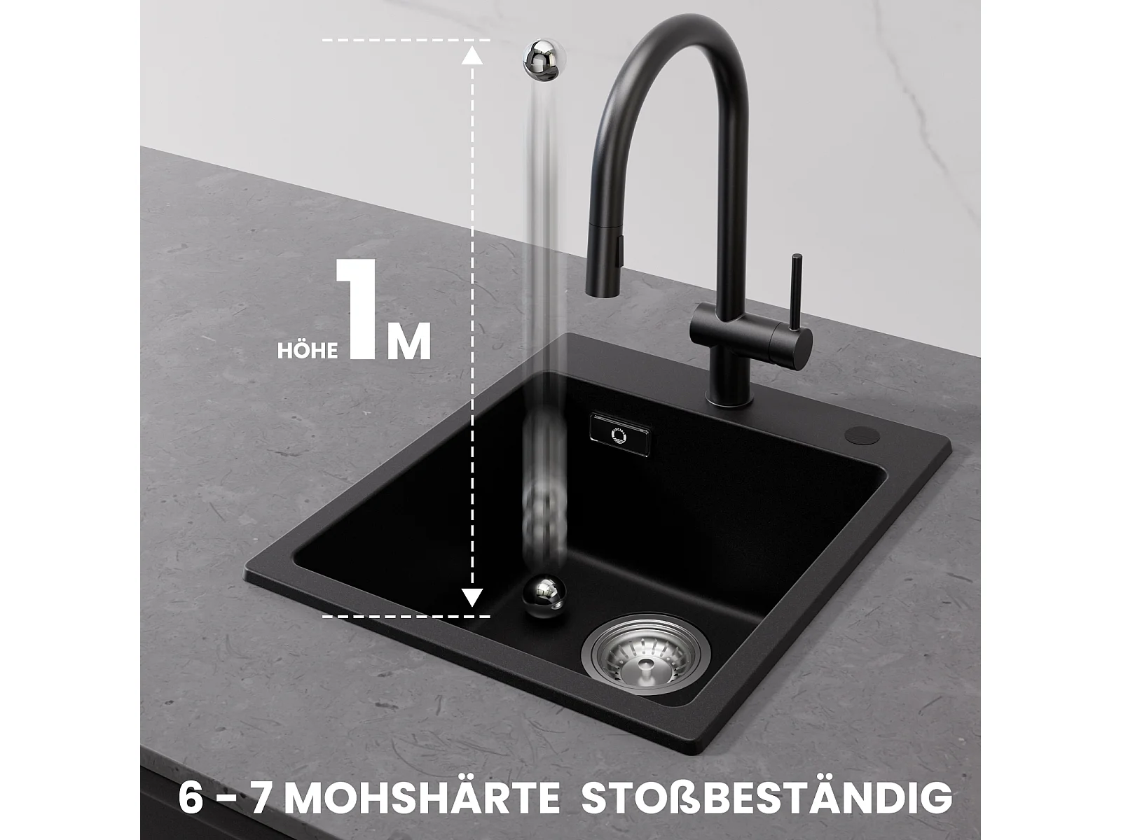 Lavello da Cucina Cecipa max 40x45 cm in Quarzo e Resina Lavello in Quarzo 1 Vasca Nero + Miscelatore Nero con Doccia Estraibile 2 Getti