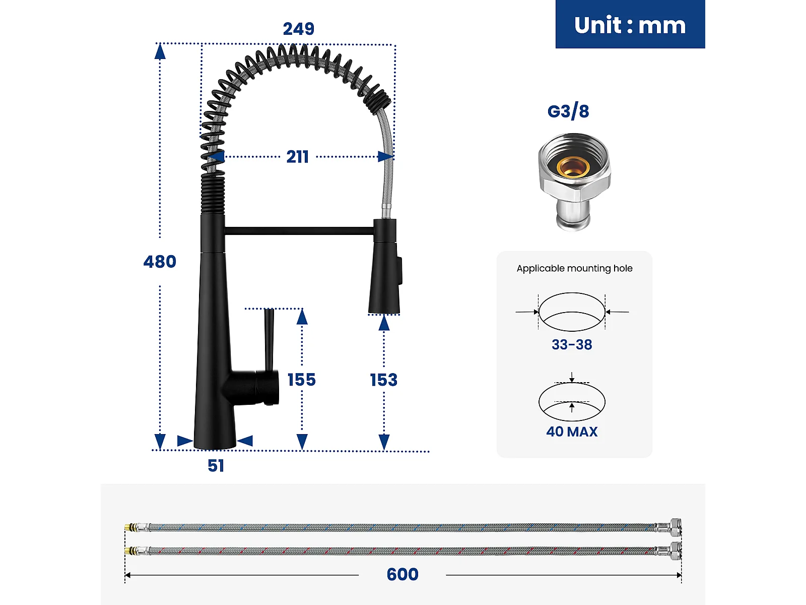 Lavello Cucina Cecipa max Nero 40*45CM - Lavello in Acciaio Inox 1 Vasca con Sifone e Troppopieno + Miscelatore Cucina Molla Nera con Doccetta Estraibile