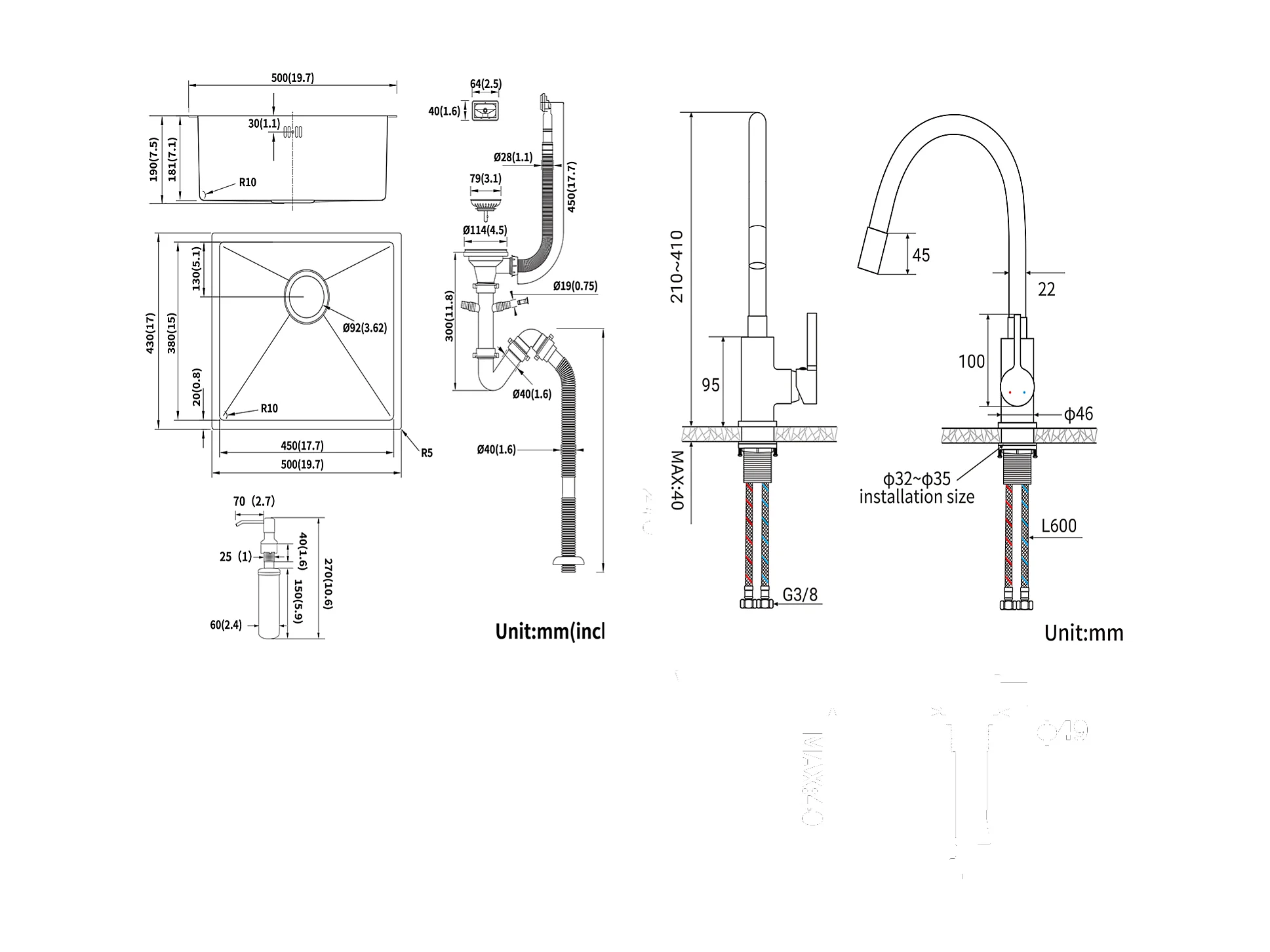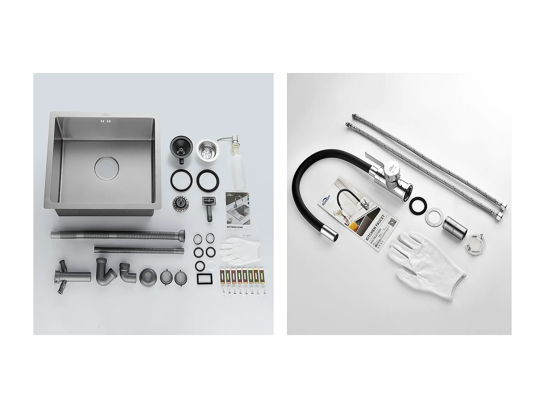 Lavello da Cucina Inox 1 Vassoio 50*43*18CM con Distributore di Sapone+Rubinetto da Cucina Flessibile Becco Alto Orientabile