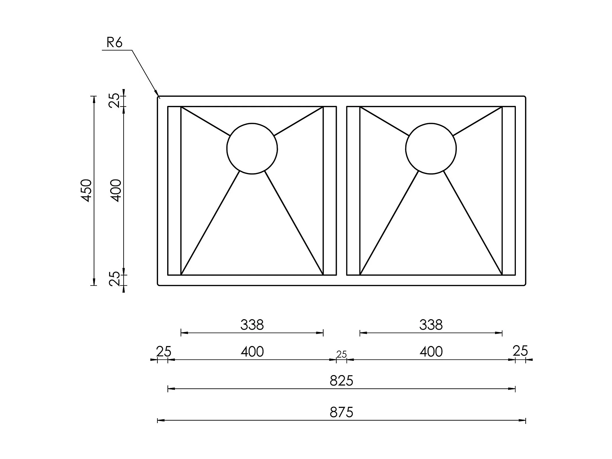 Lavello FOCUS 3" 2 vasche ACCIAIO INOX INCASSO SOTTOTOP 87,5X45 prof.19