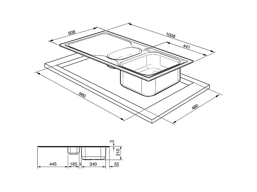 Lavello appoggio 120x50 2 vasche e gocciolatoio destro Mondial inox