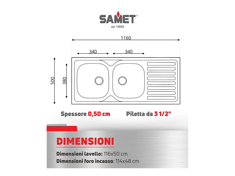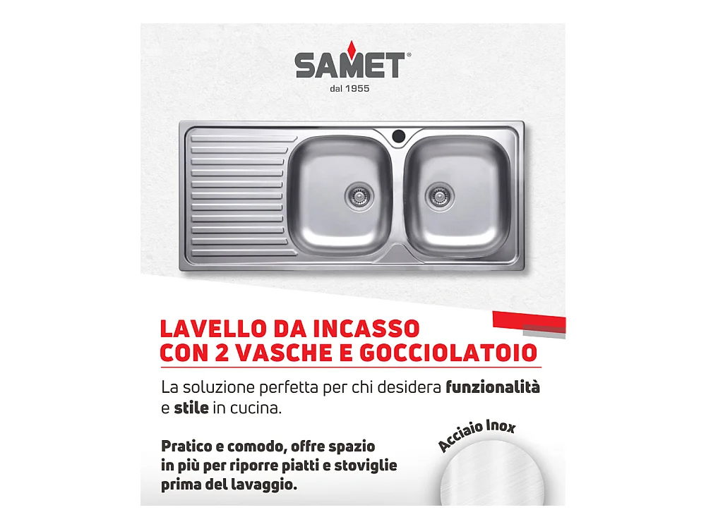 Lavello incasso acciaio inox 116x50 cm doppia vasca e gocciolatoio destro SA138