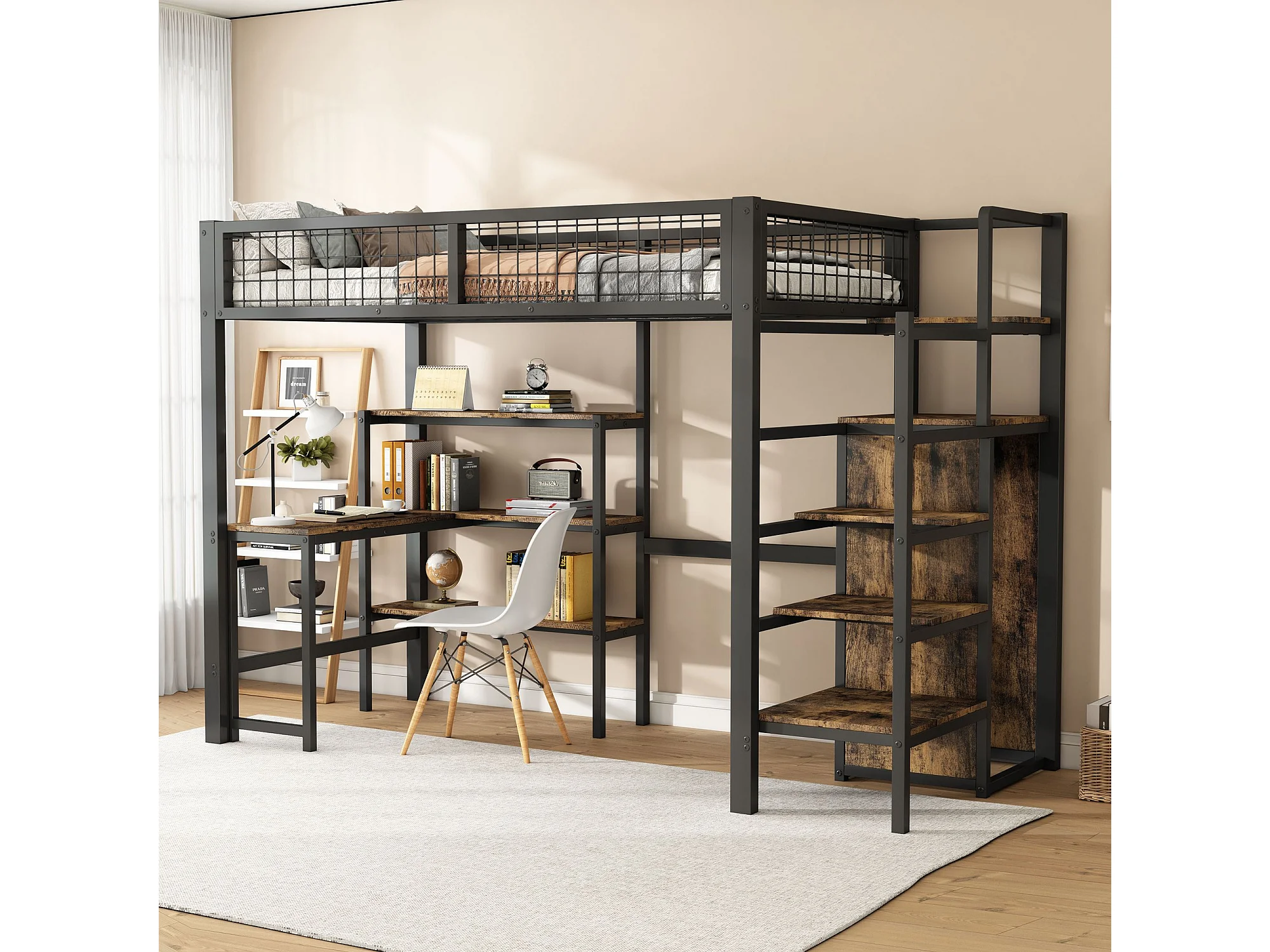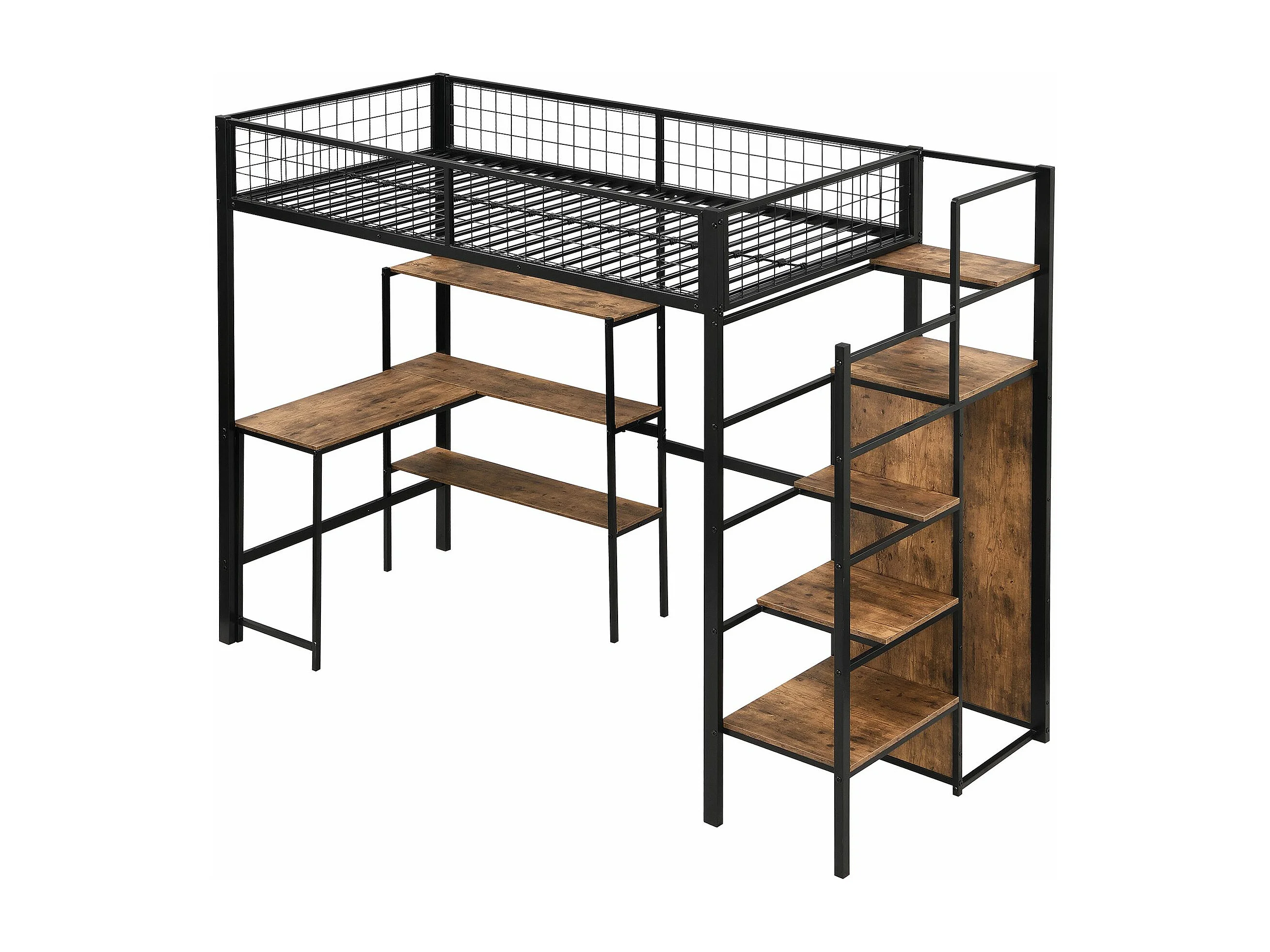 Letti a castello 90x200cm, letto in ferro, sottotavolo, diversi ripiani, armadio a muro, nero
