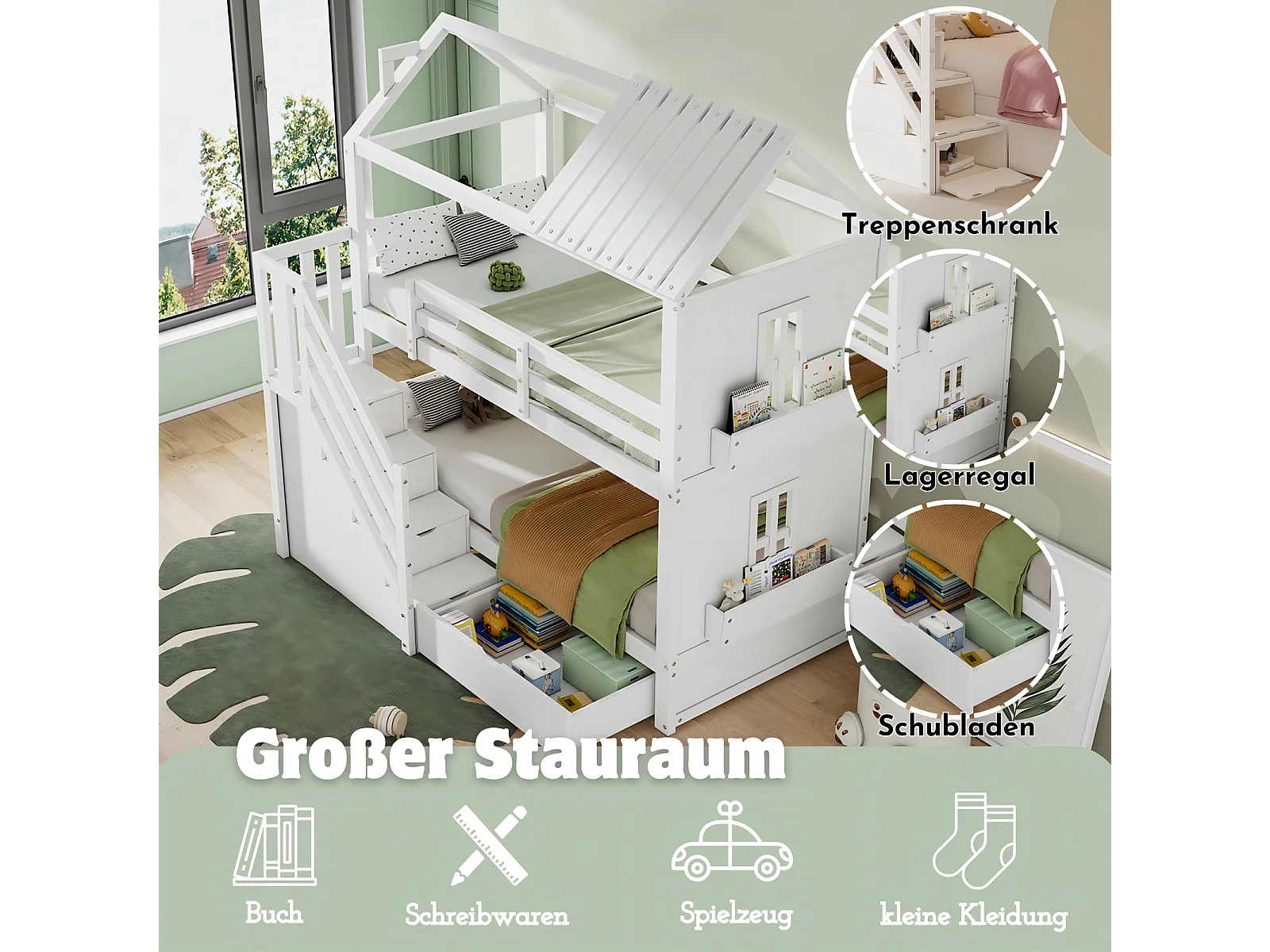Letti a castello di cabina, 2x90x200 cm, con scale di spazio di archiviazione e cassetti e scaffali