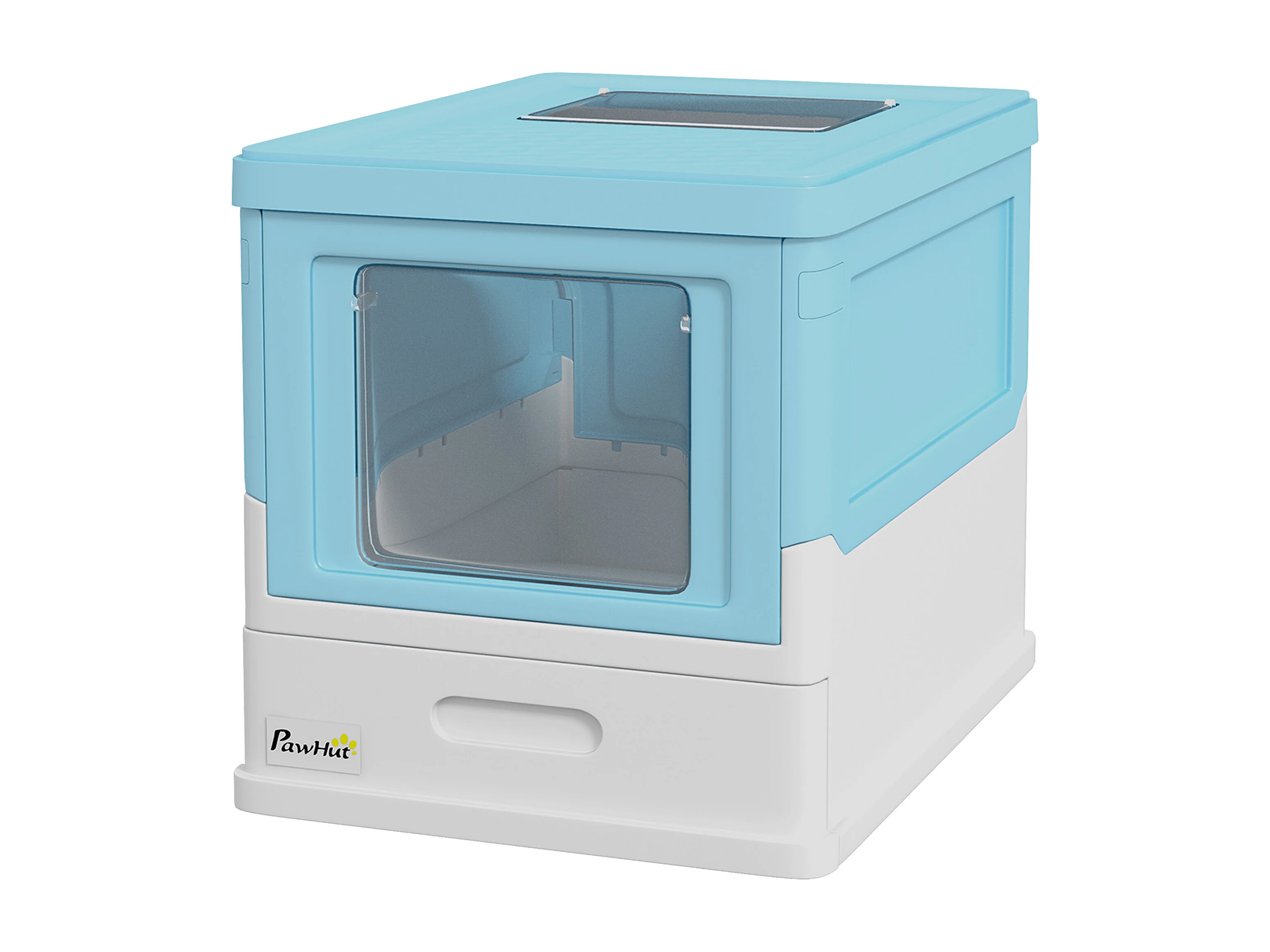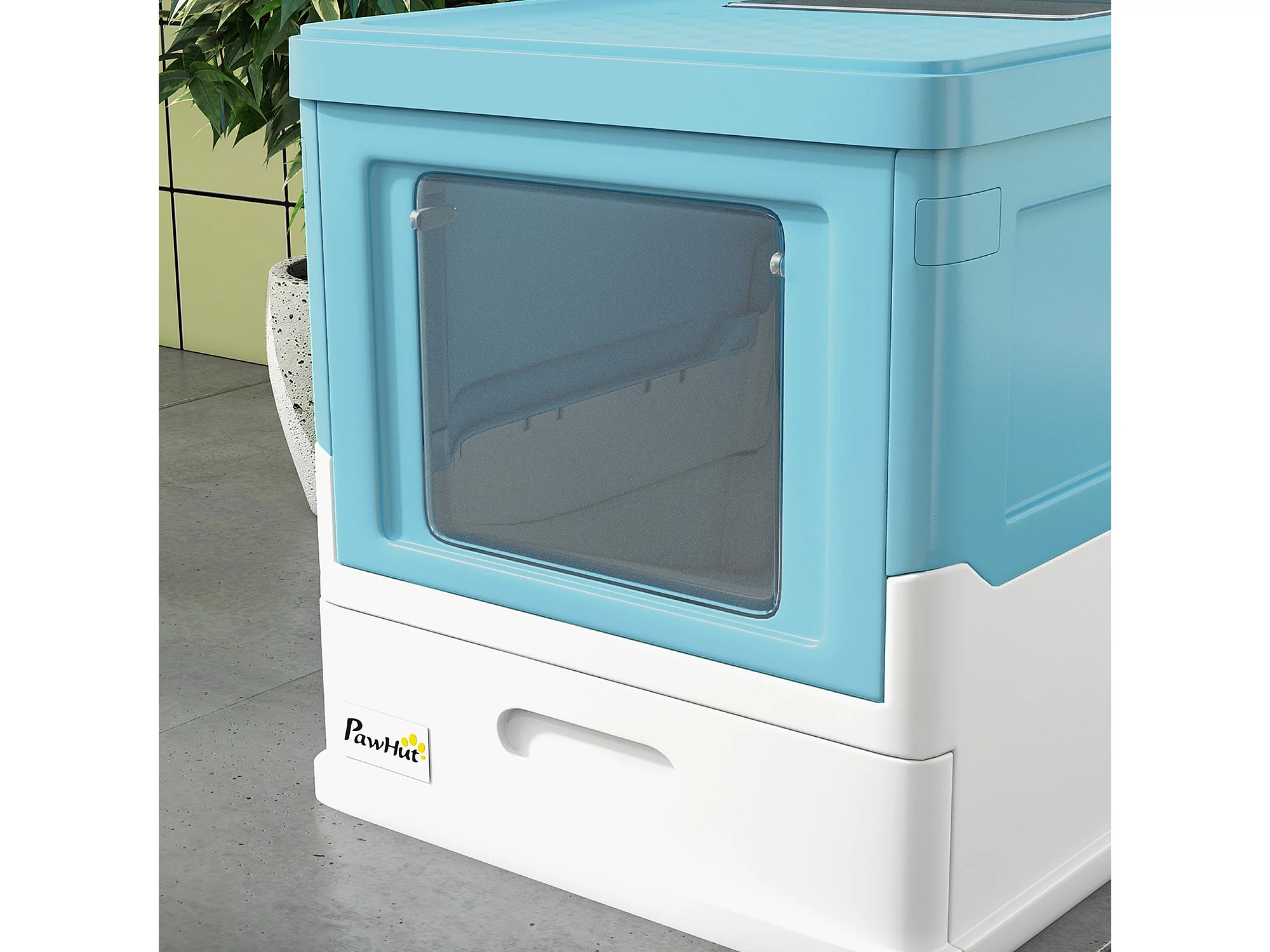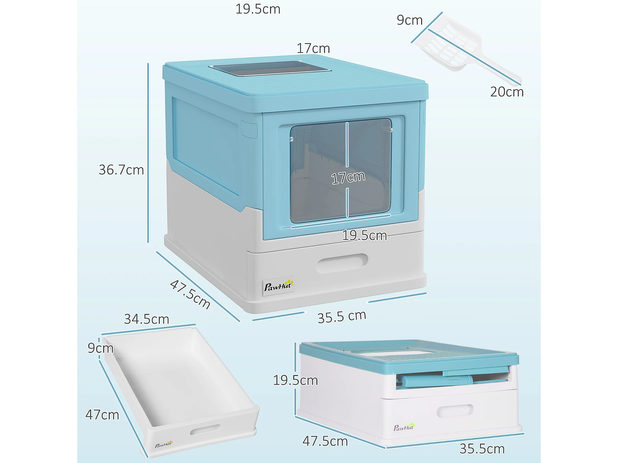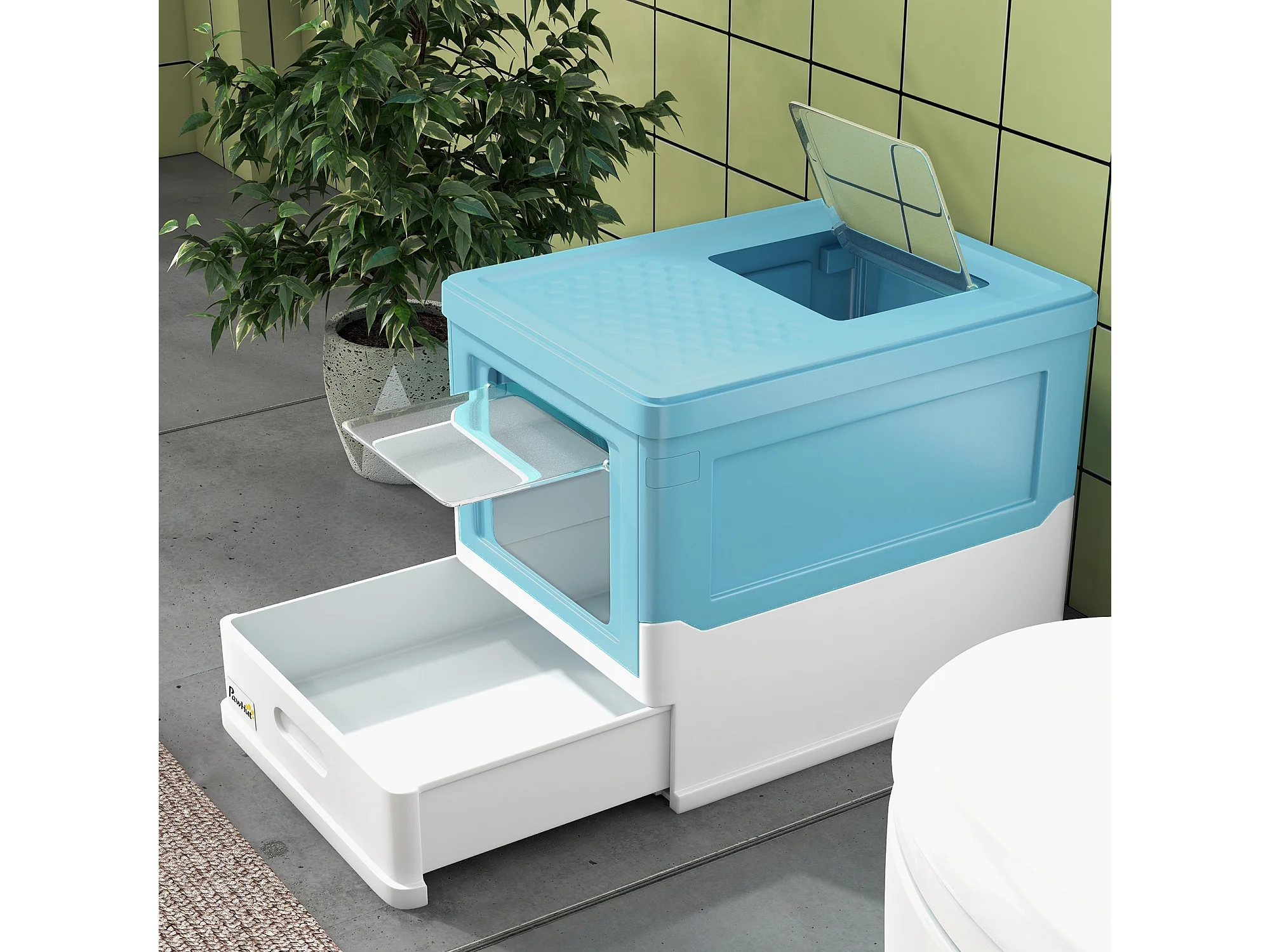 Lettiera per gatti chiusa con vassoio estraibile e paletta azzurro