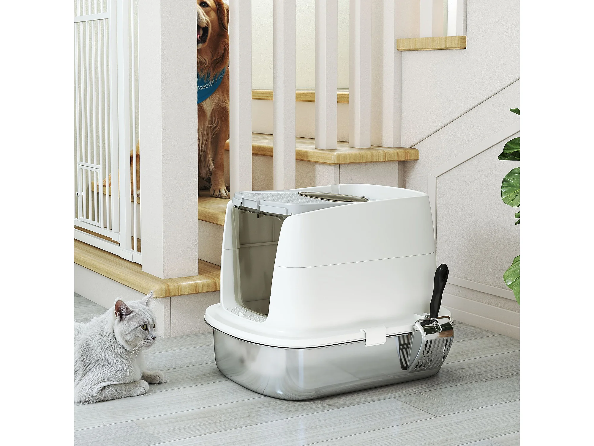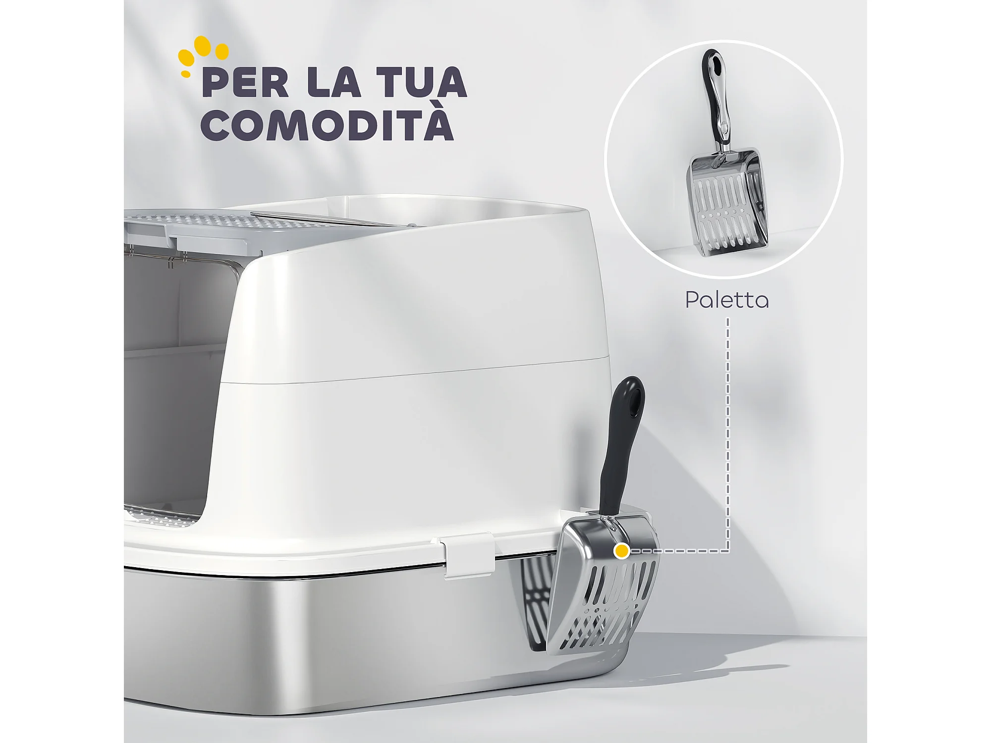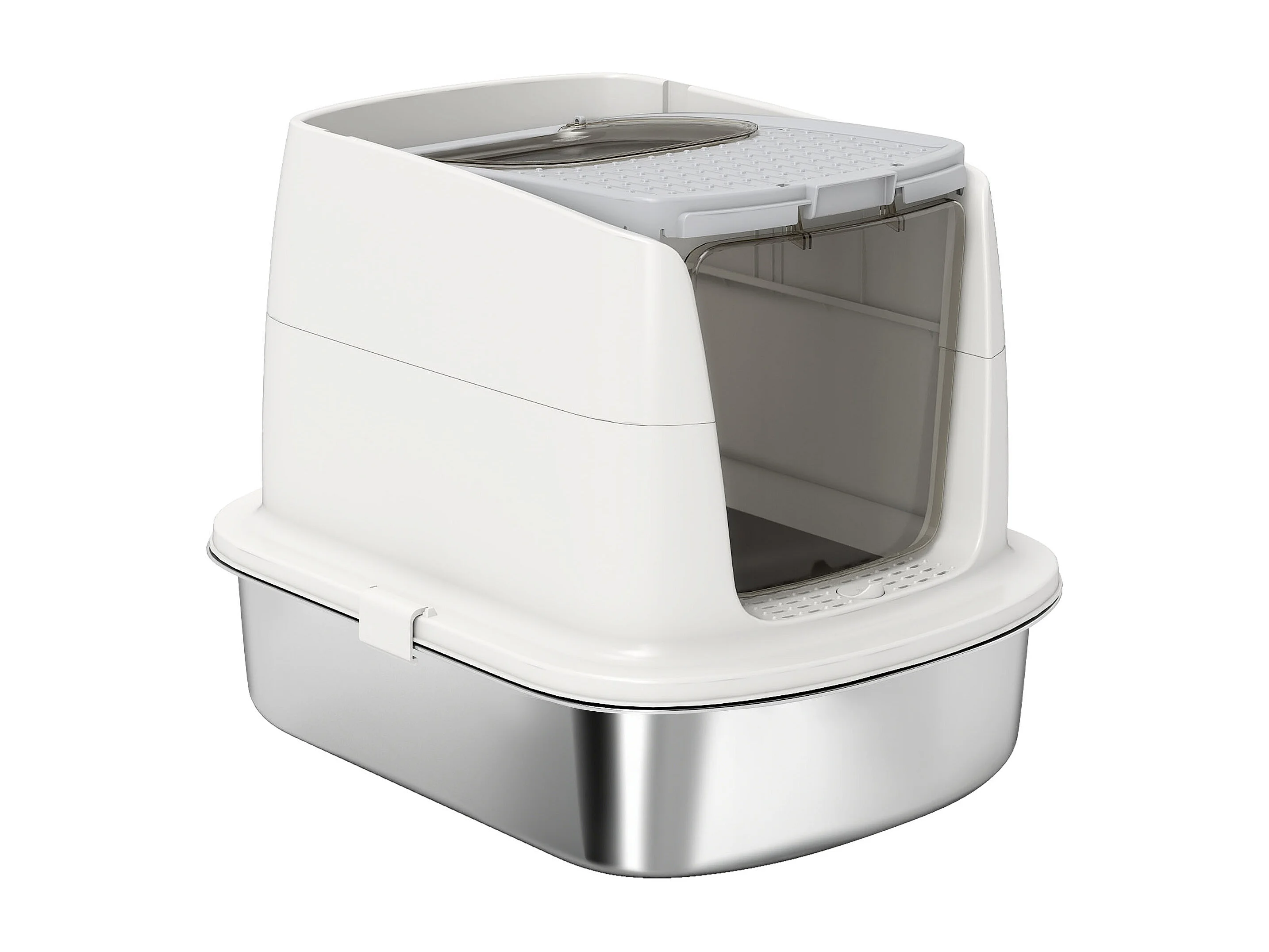 Lettiera per gatti chiusa in pp con vassoio in acciaio bianco e argento