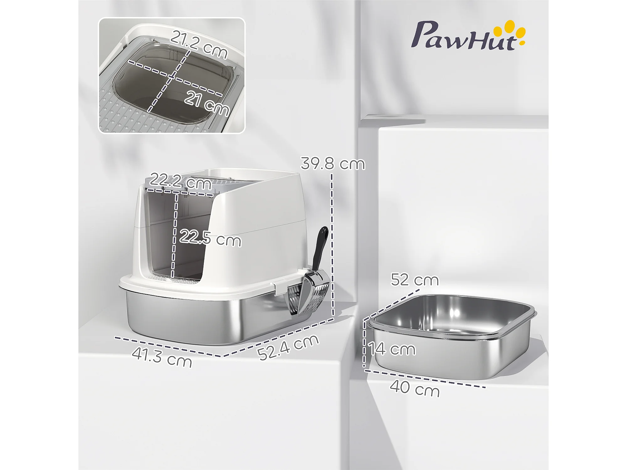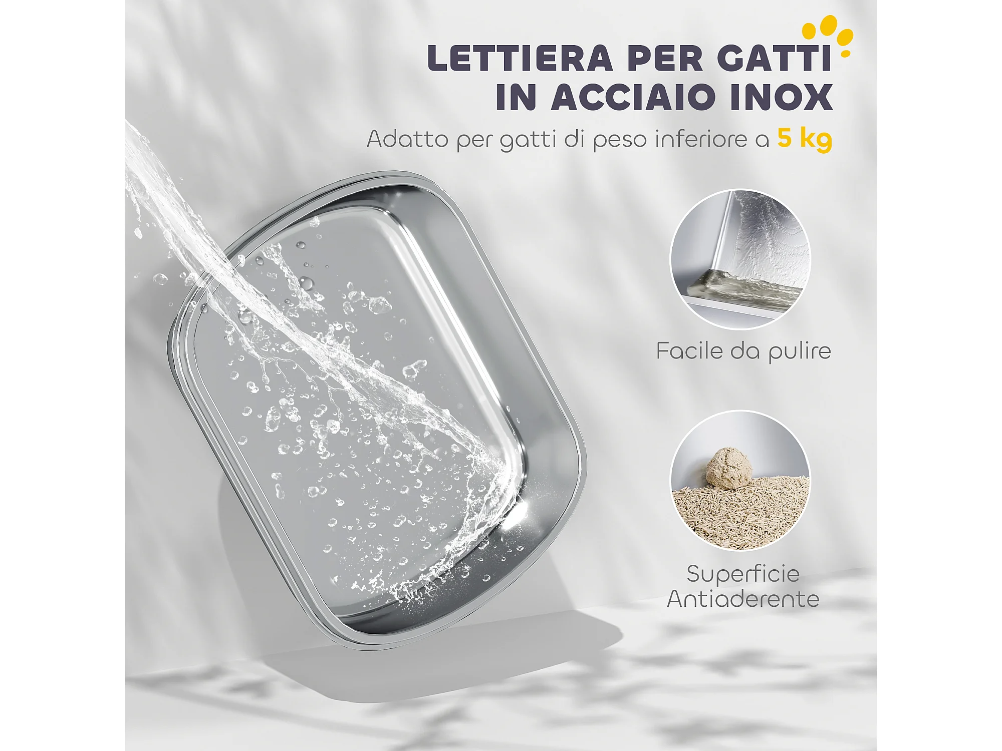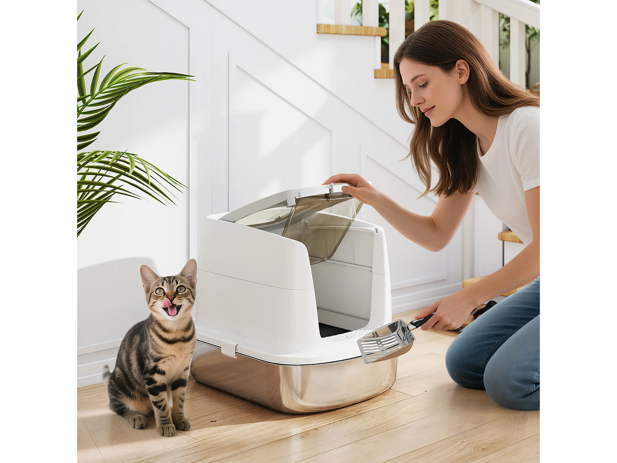 Lettiera per gatti chiusa in pp con vassoio in acciaio bianco e argento