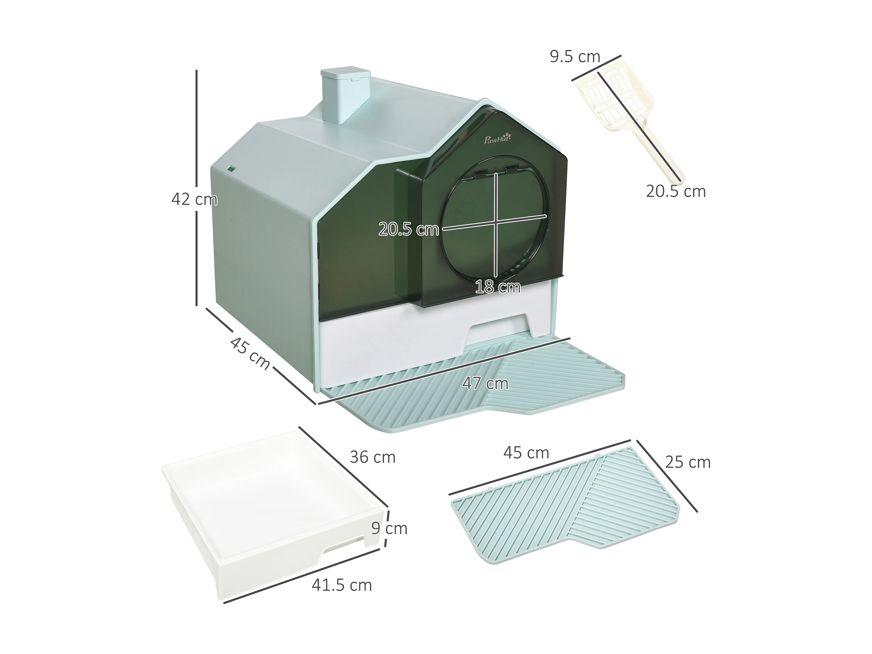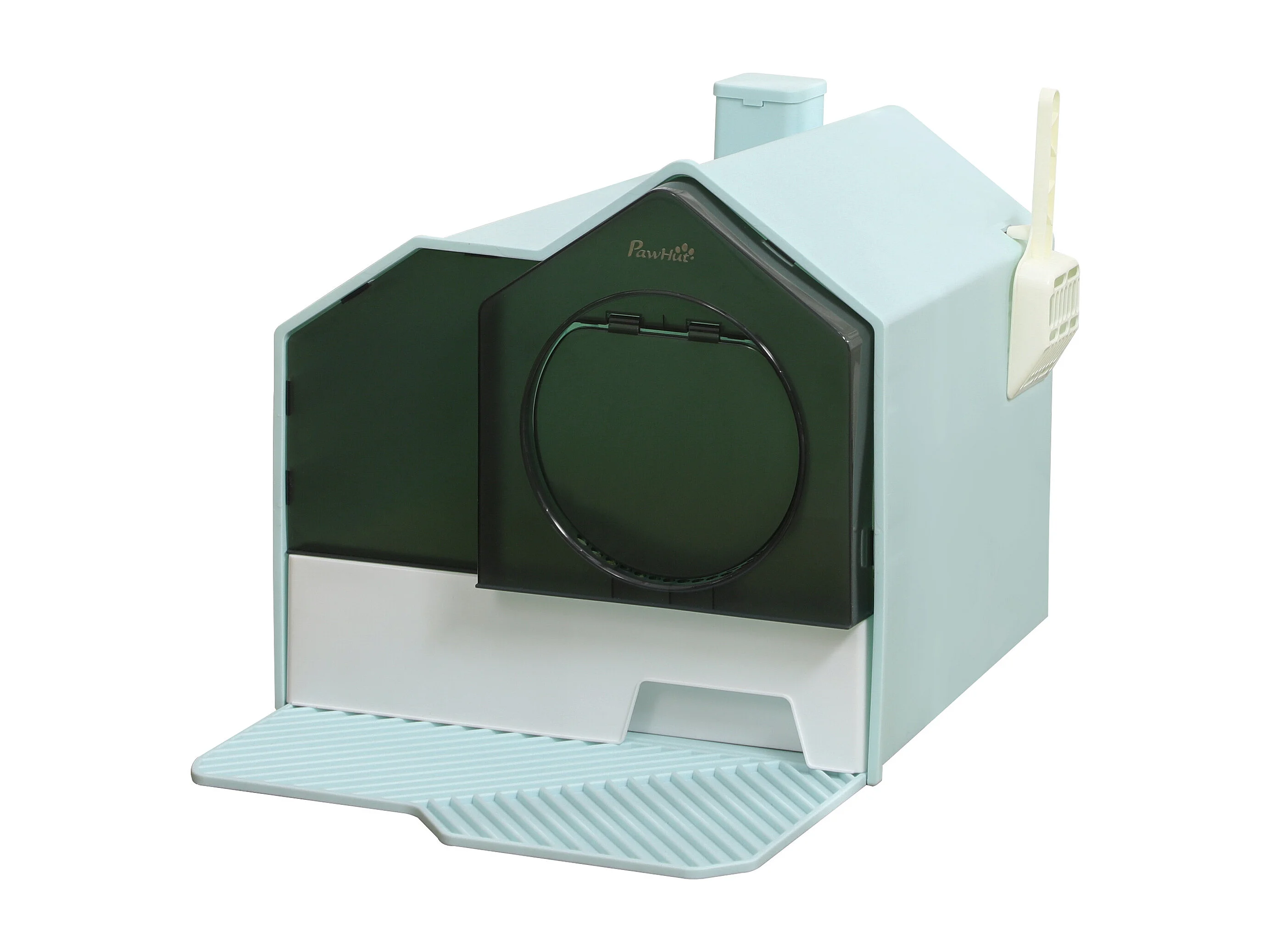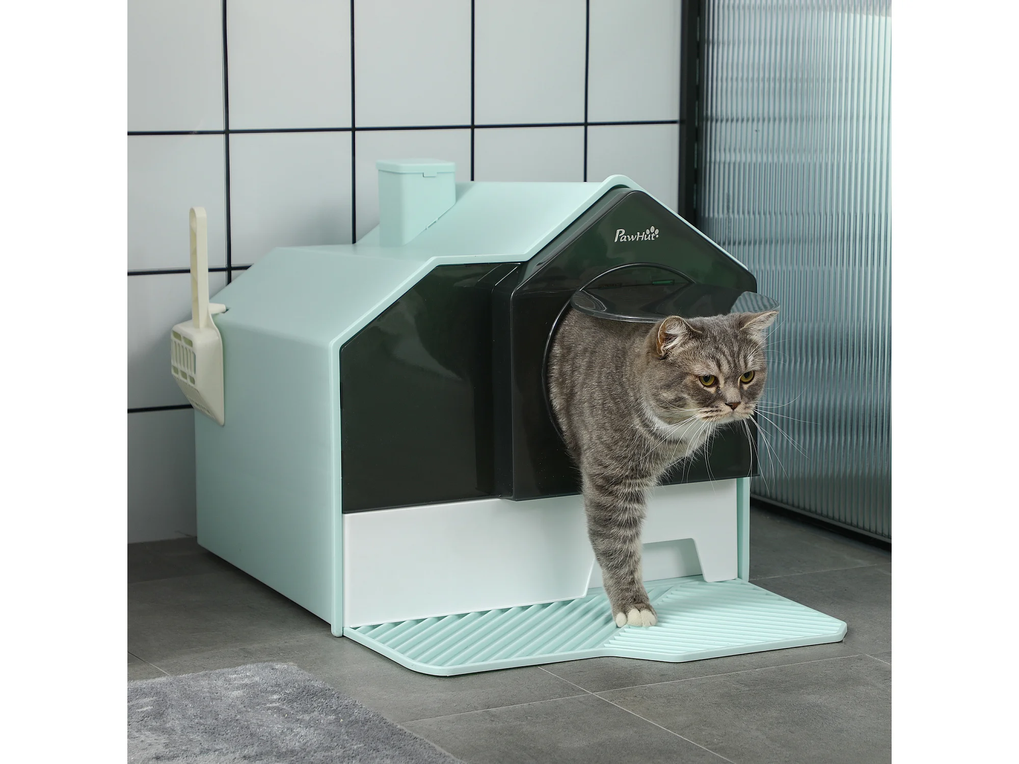 Lettiera per gatti chiusa con vassoio estraibile e paletta azzurro