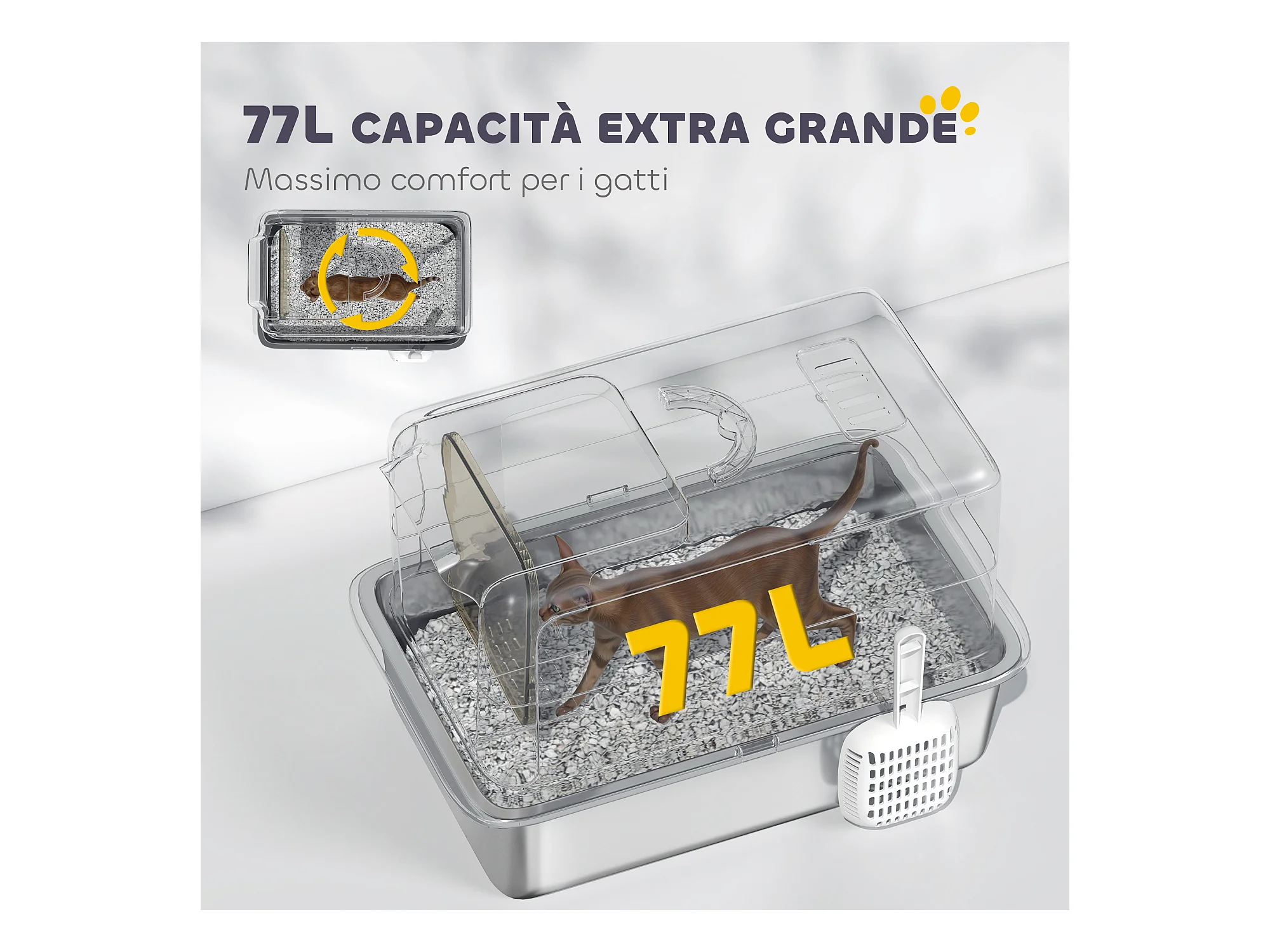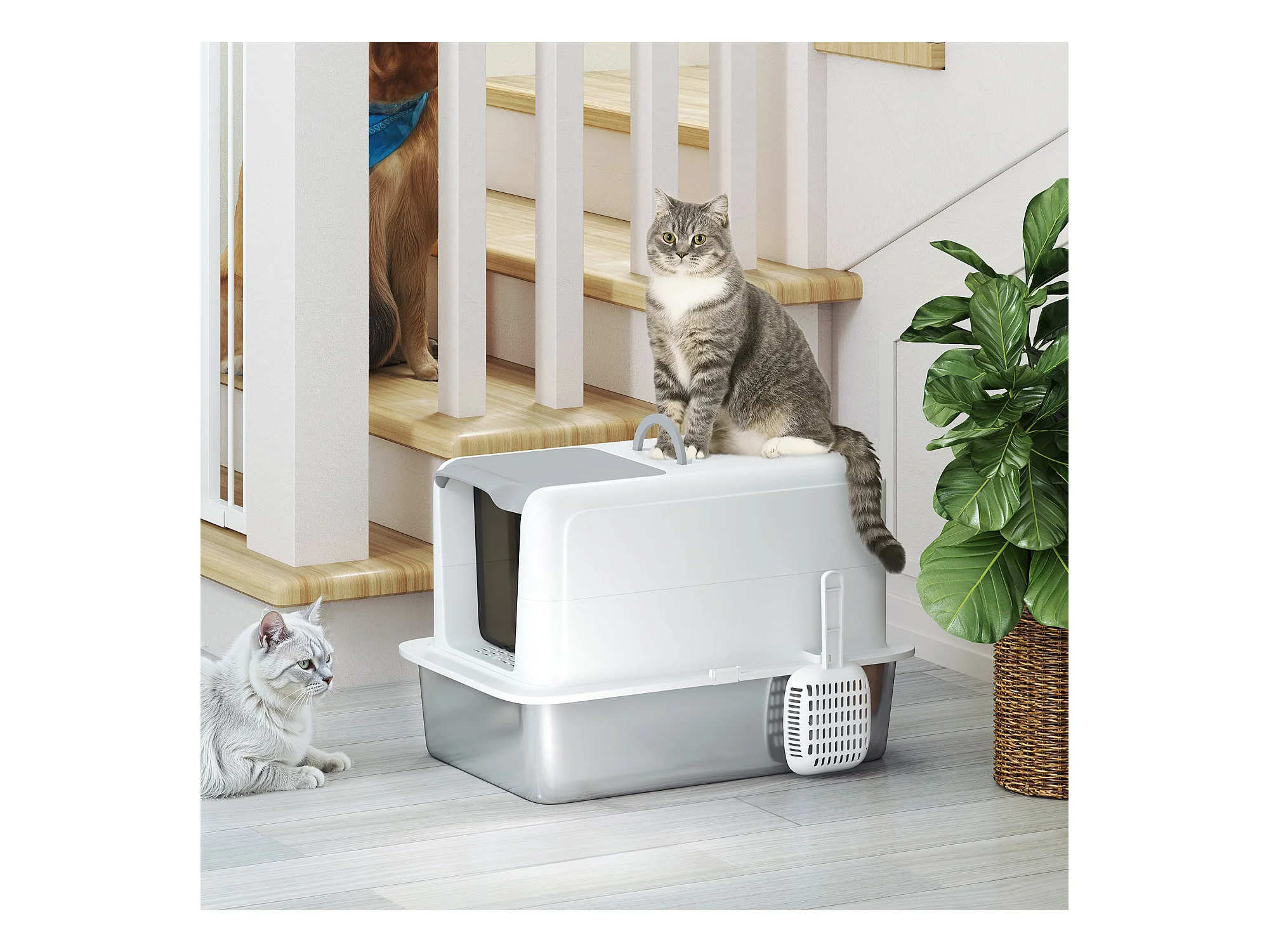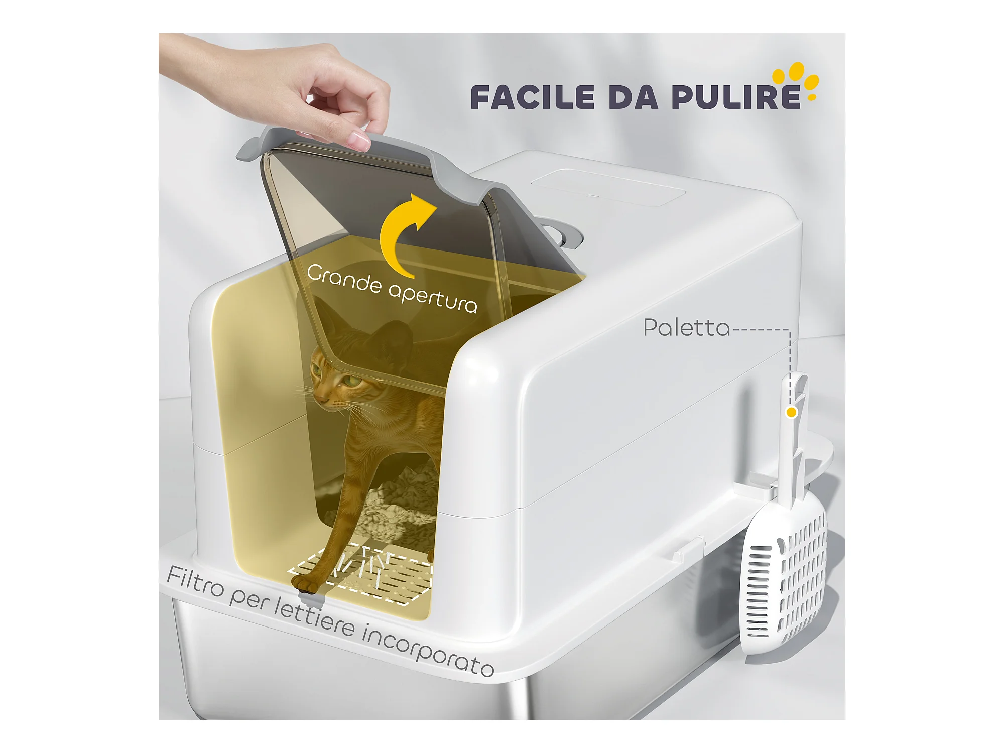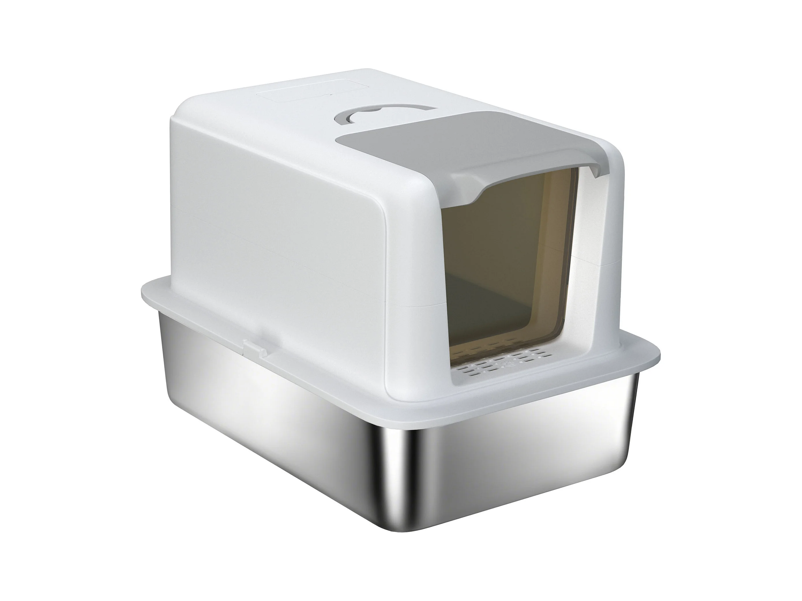 Lettiera per gatti chiusa in pp con vassoio in acciaio bianco e argento