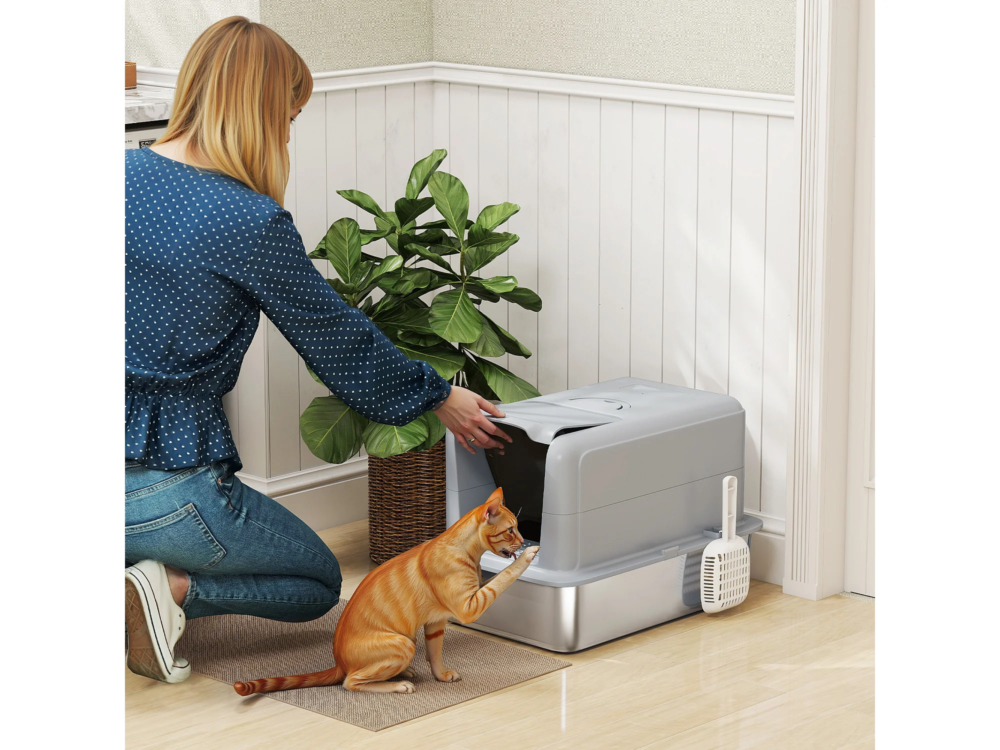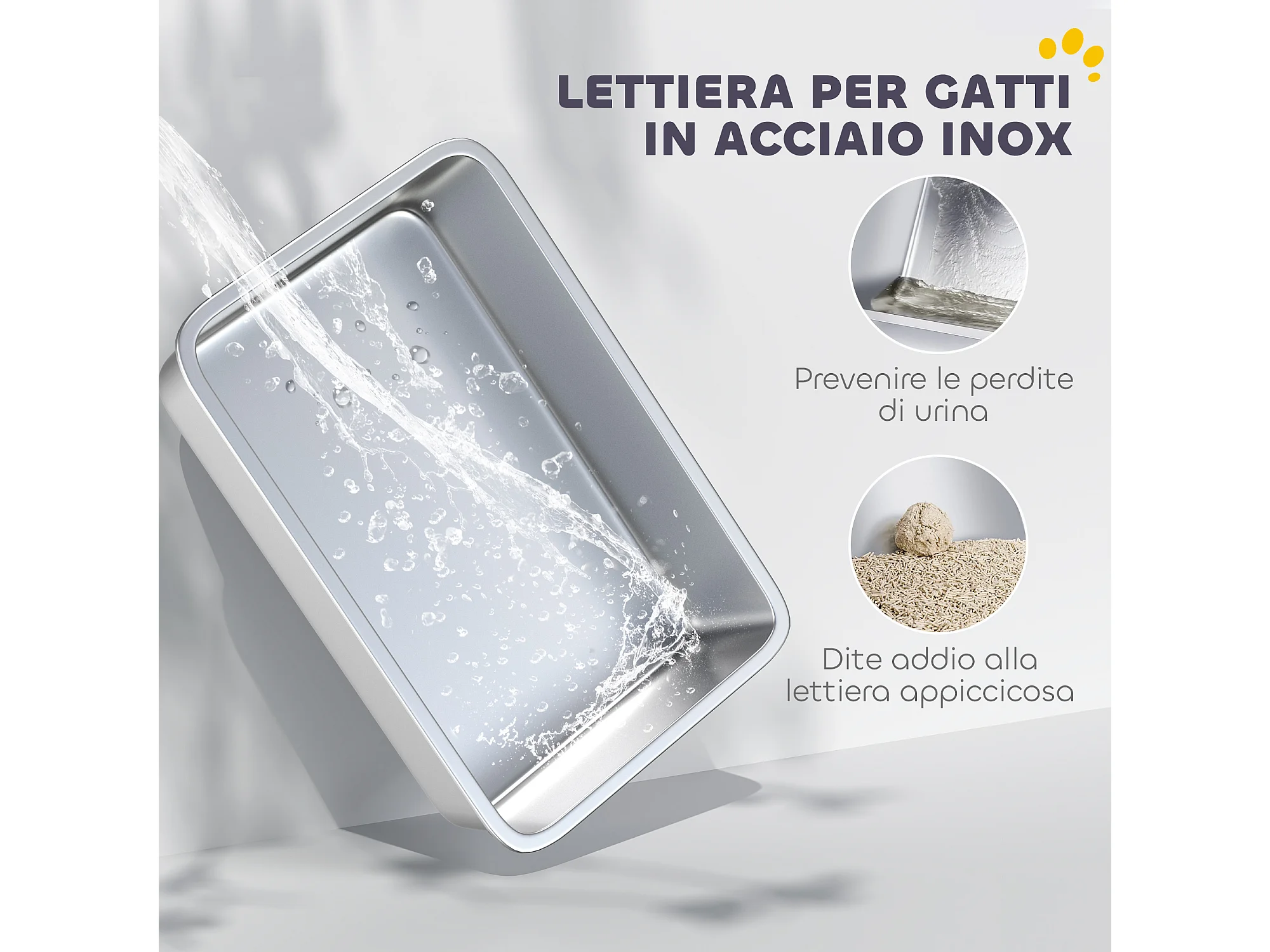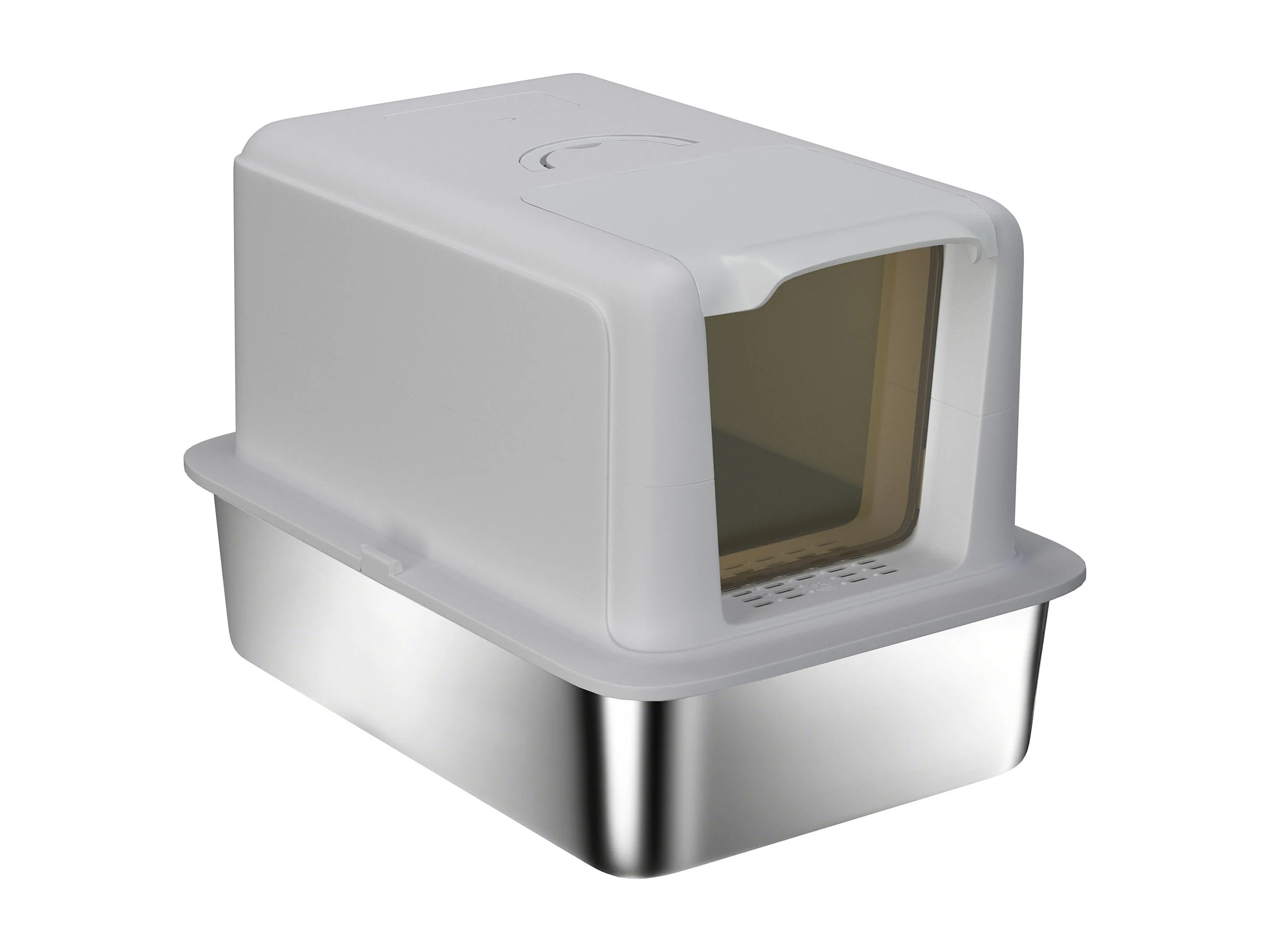 Lettiera per gatti in pp con vassoio in acciaio inox grigio e argento