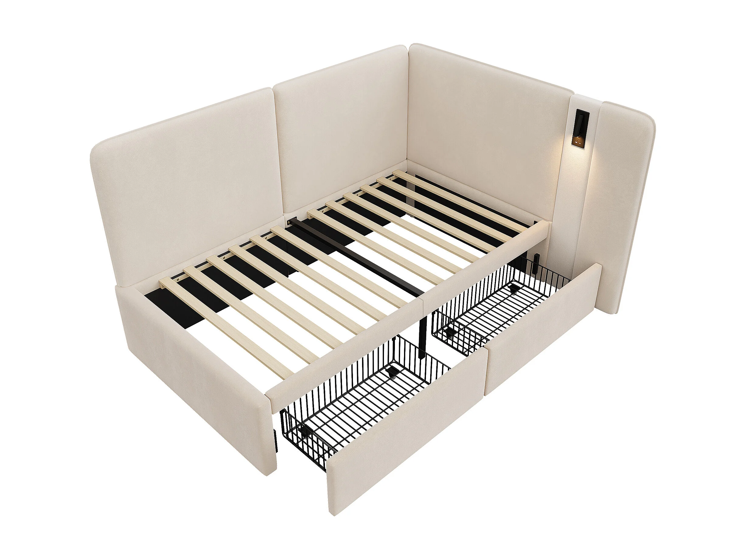 Lettino imbottito per bambini - 90 x 200 cm - con 2 cassetti + porta USB + lampada da lettura - velluto - beige