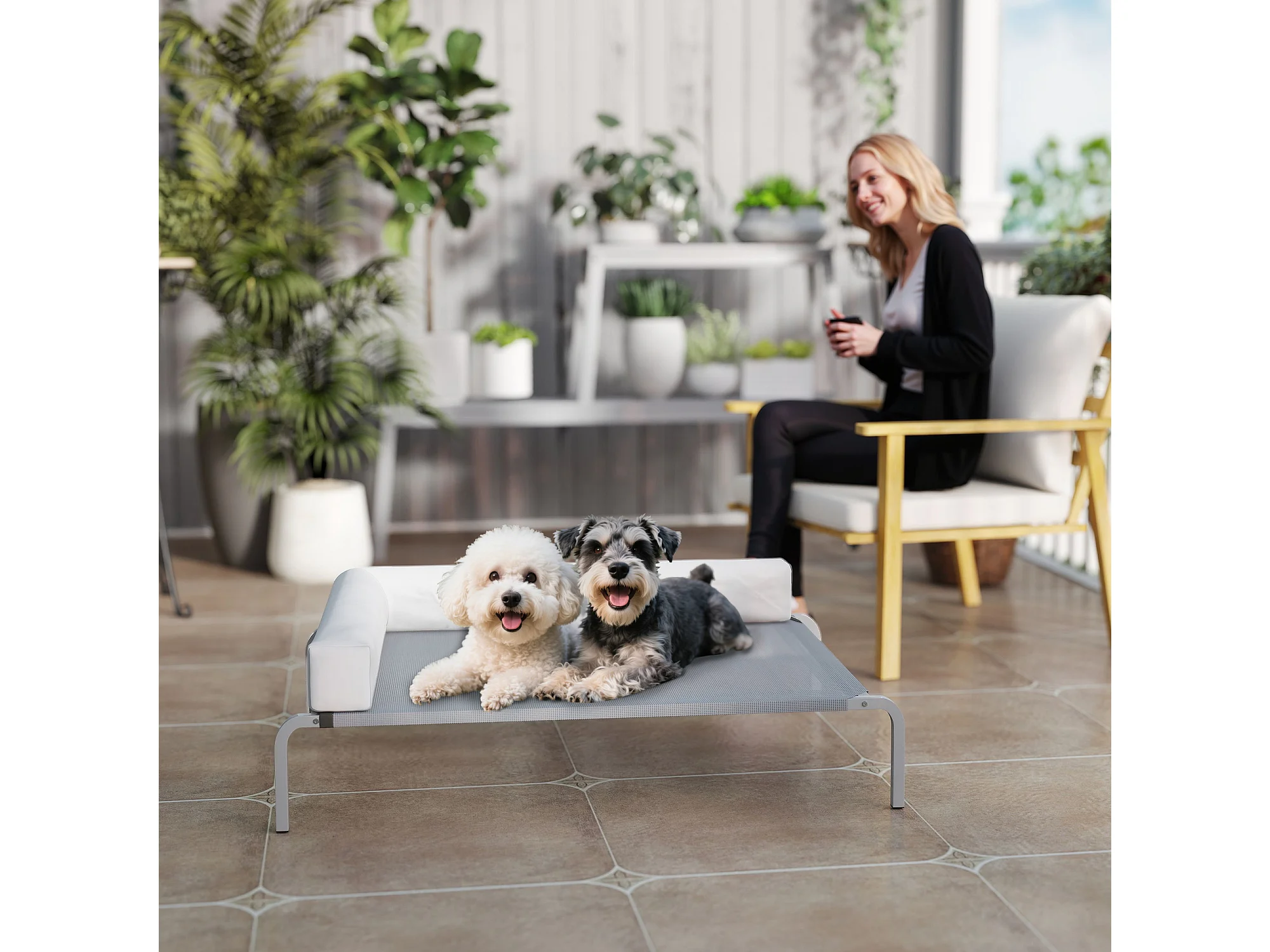 Lettino per cani rialzato con cuscino a u nero e argento