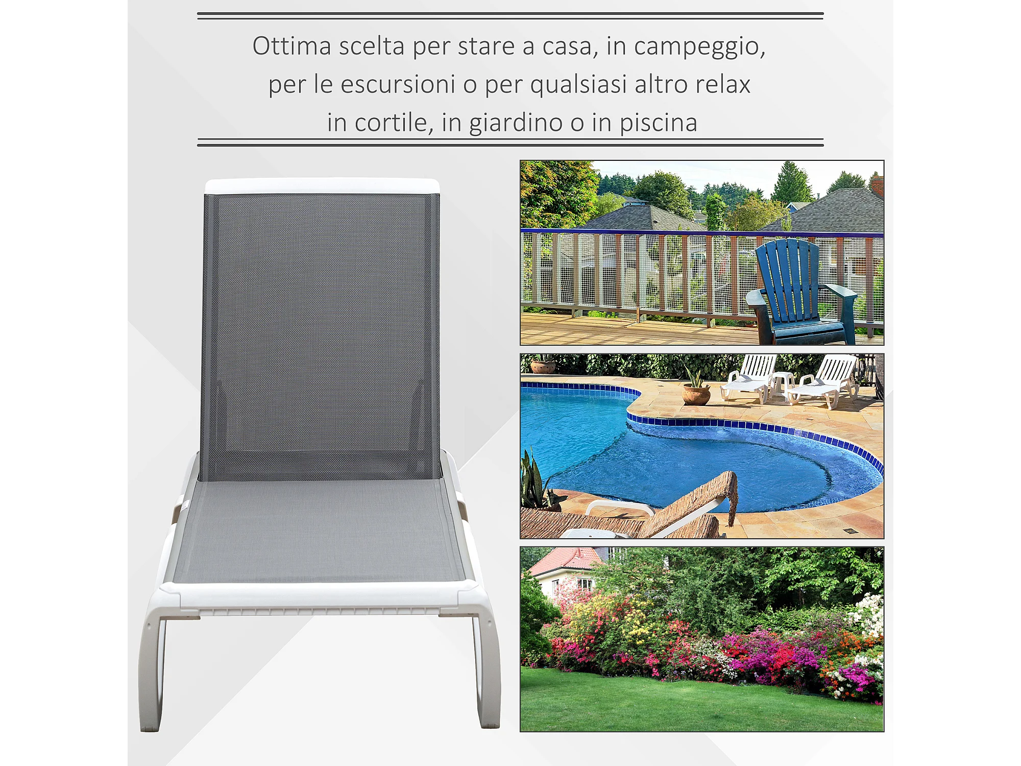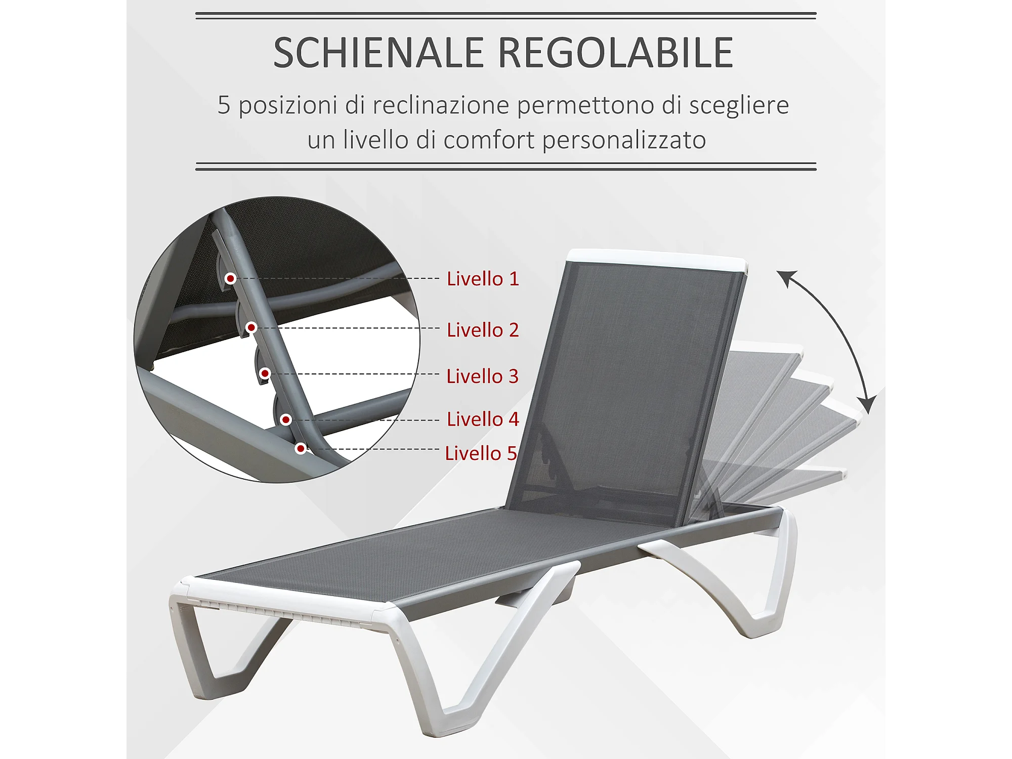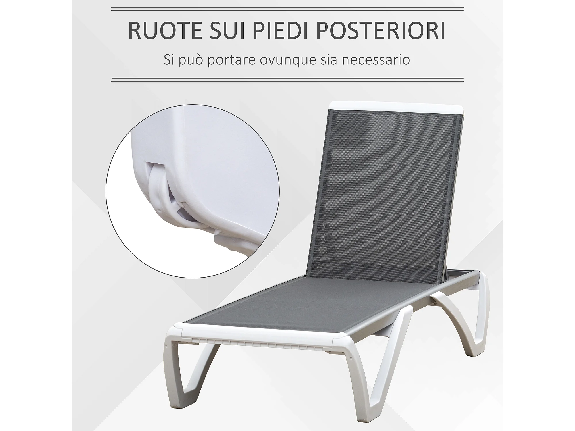 Lettino prendisole con schienale reclinabile su 5 livelli e rotelle