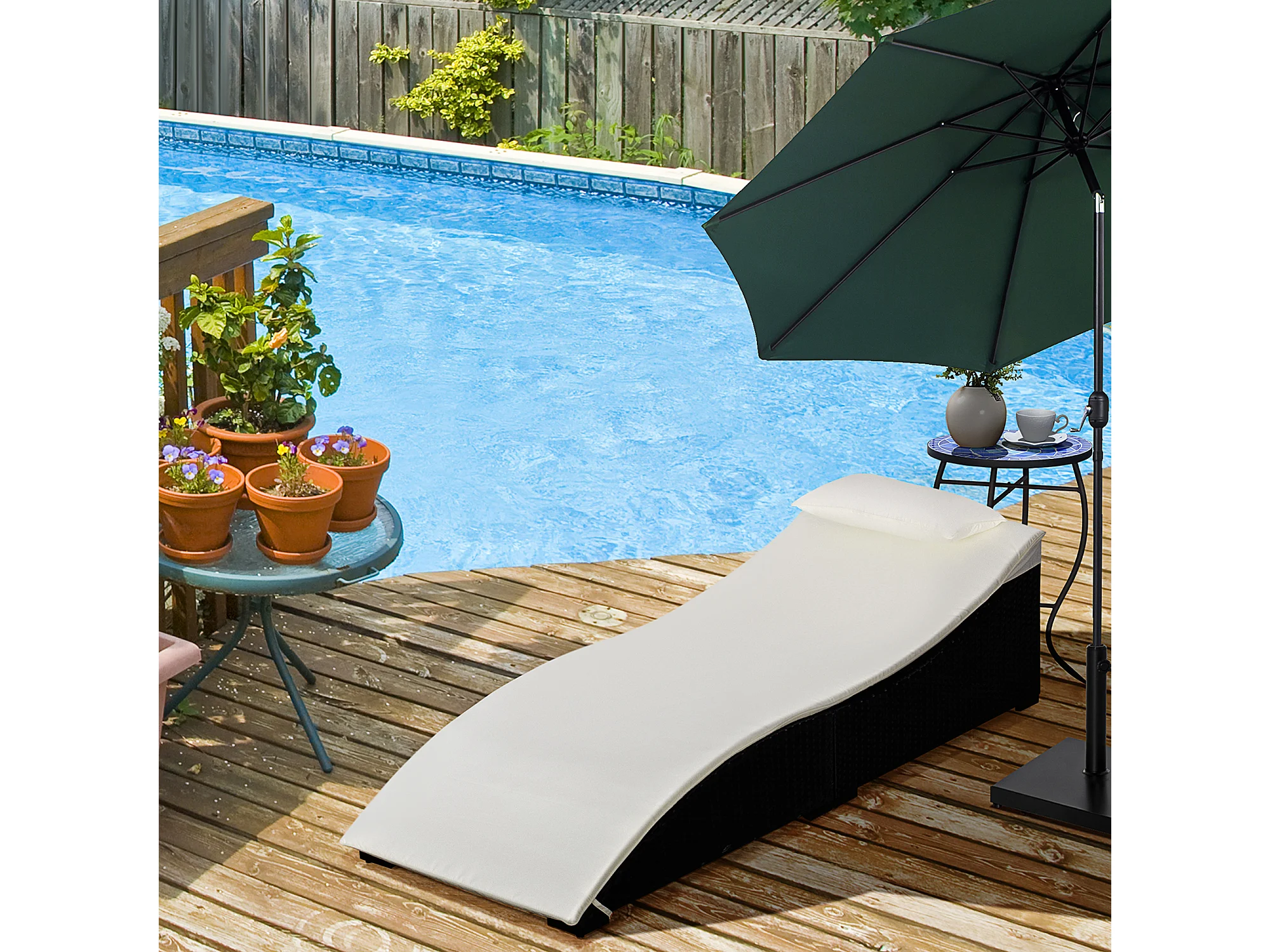 Lettino Prendisole con Tavolo e Cuscino Nero in Polyrattan