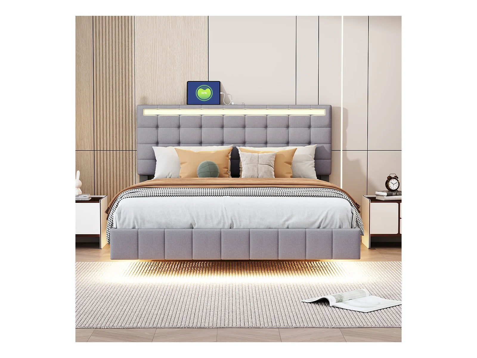 Letto imbottito 140x200 cm, LED, 4 cassetti, USB, contenitore per biancheria, base in legno - Grigio
