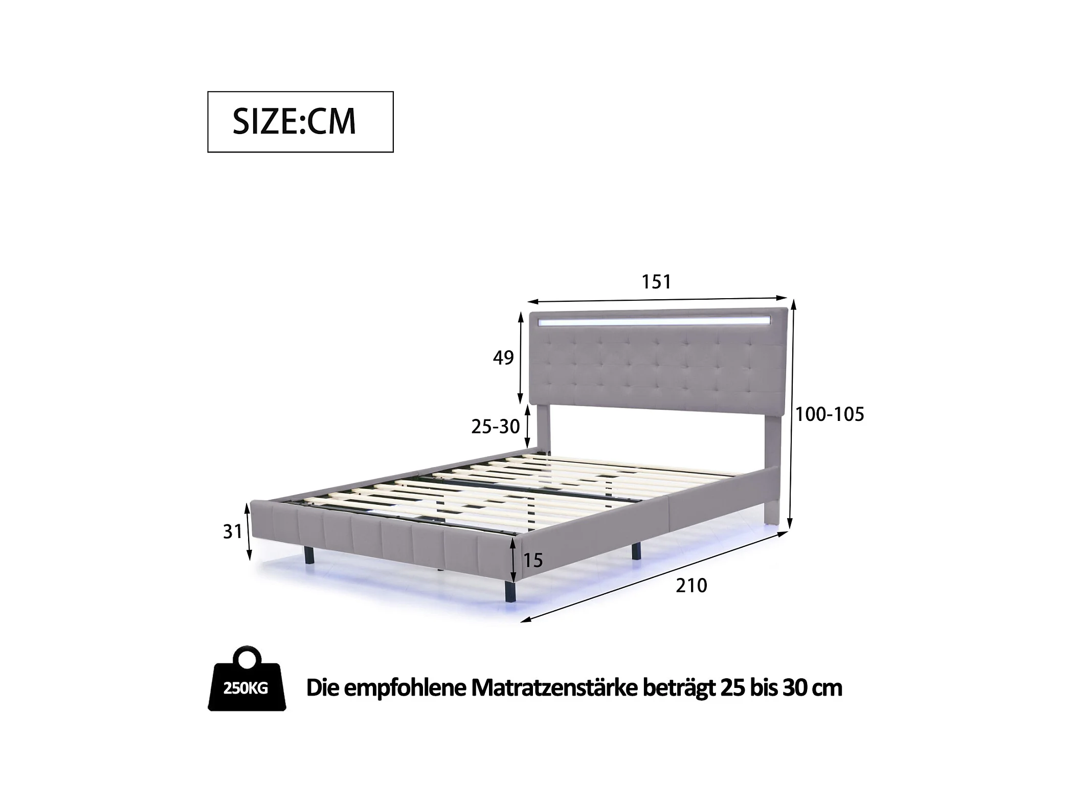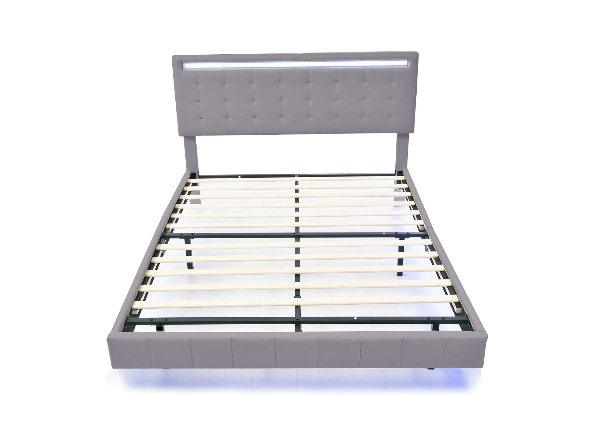Letto 140 x 200 cm con illuminazione a LED e testiera regolabile, rete a doghe, tessuto di lino, grigio