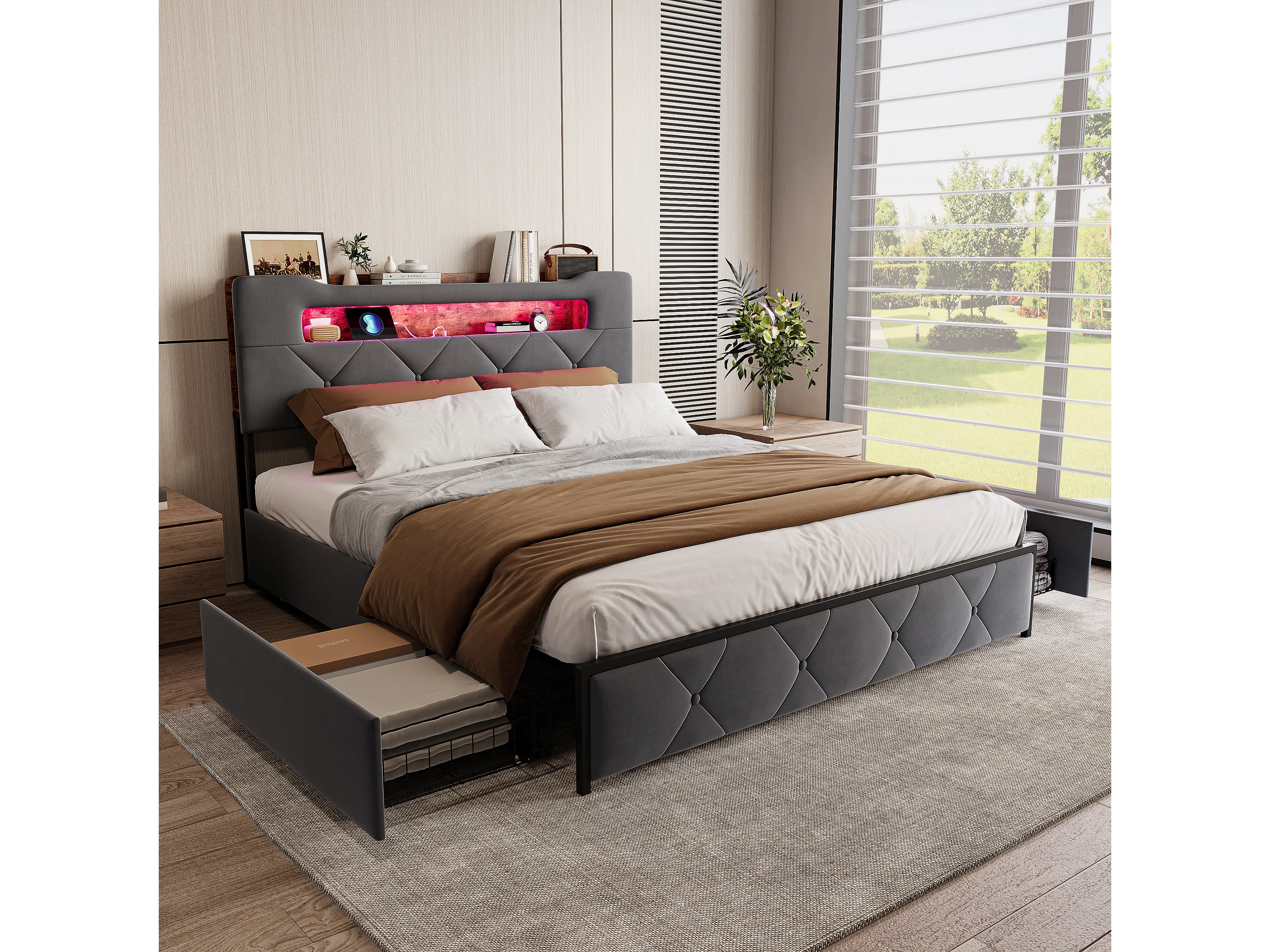 Letto 140x200 cm con 4 cassetti contenitore – Testiera con illuminazione a LED, rivestimento in tessuto grigio, struttura e pannelli in metallo