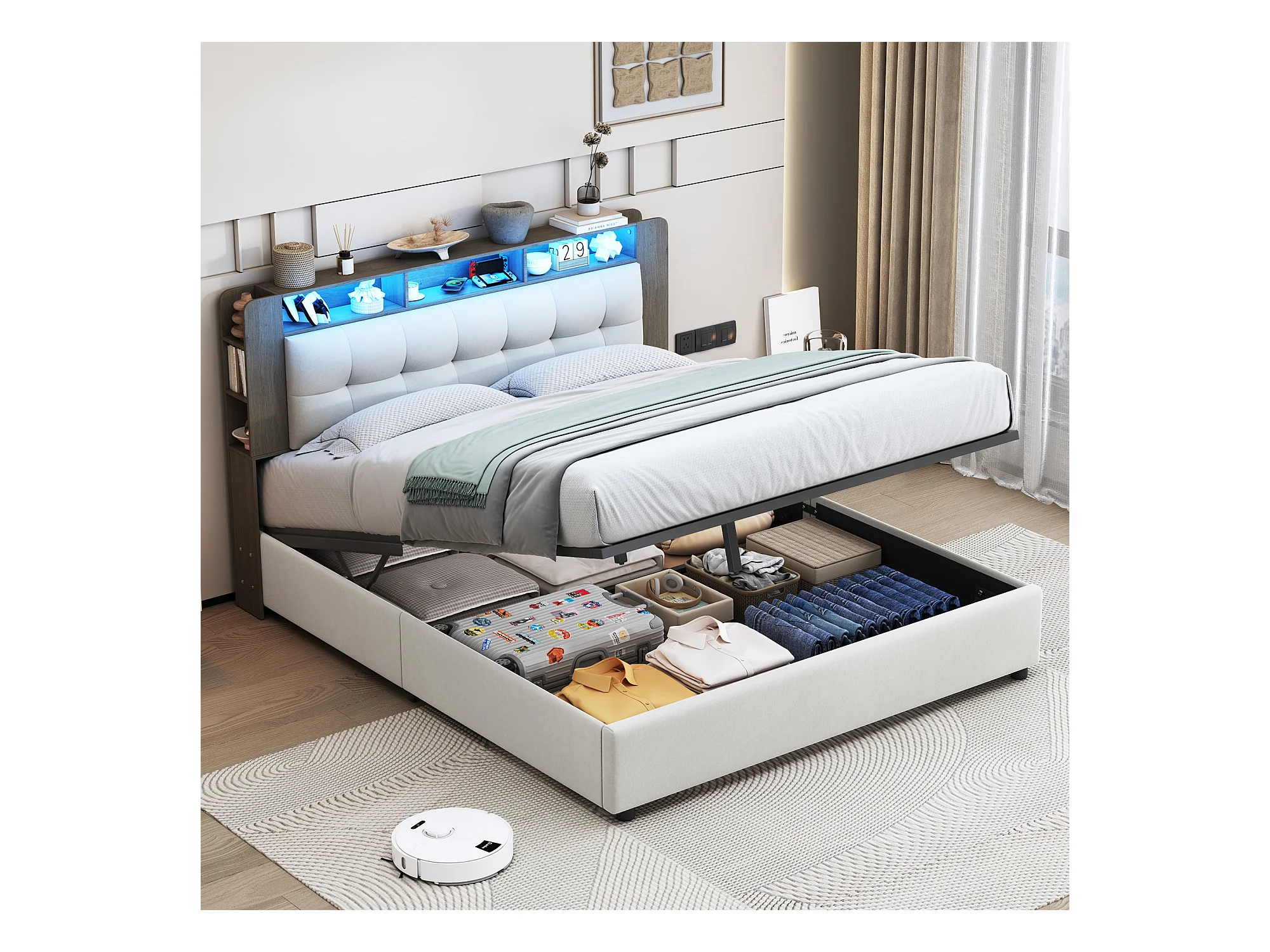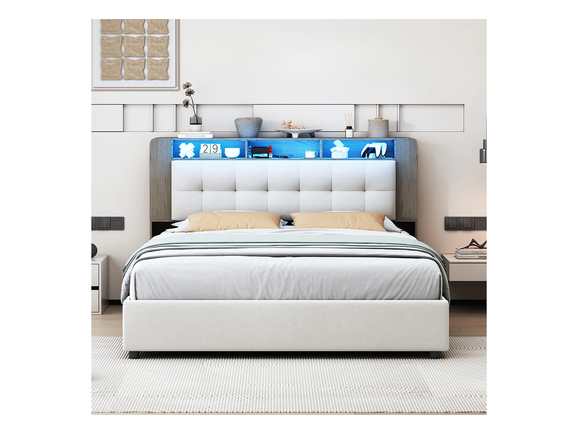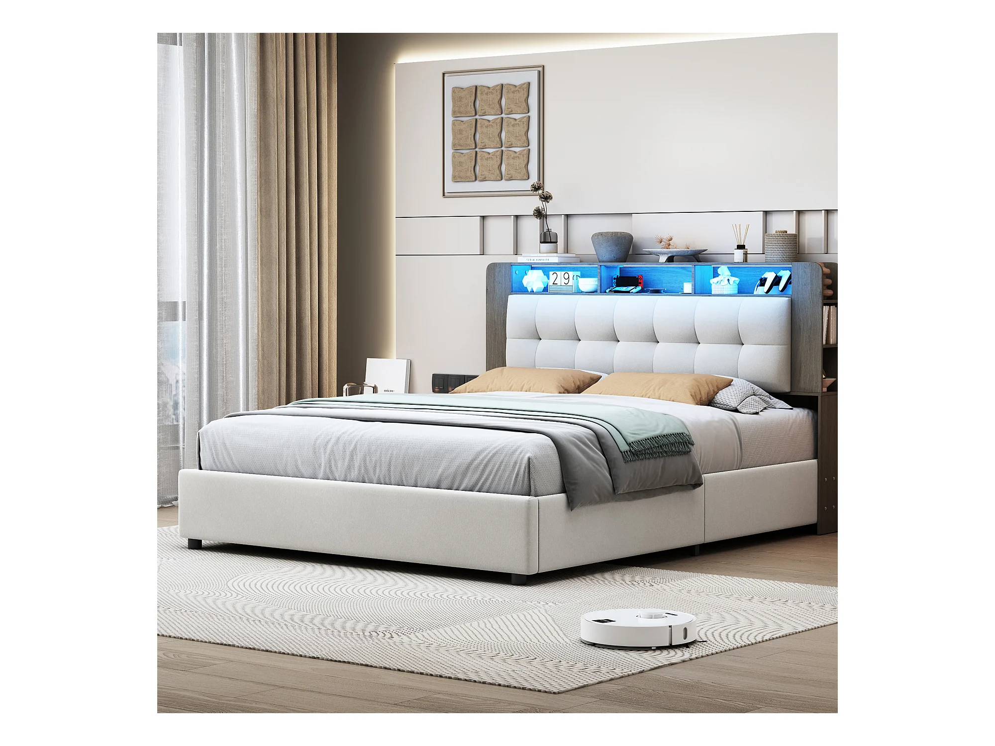 Letto 140x200 cm con rete a doghe e LED, testiera con contenitore, letto matrimoniale con contenitore, beige