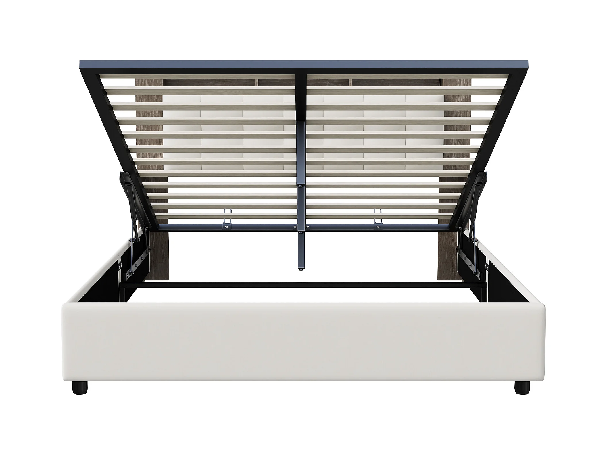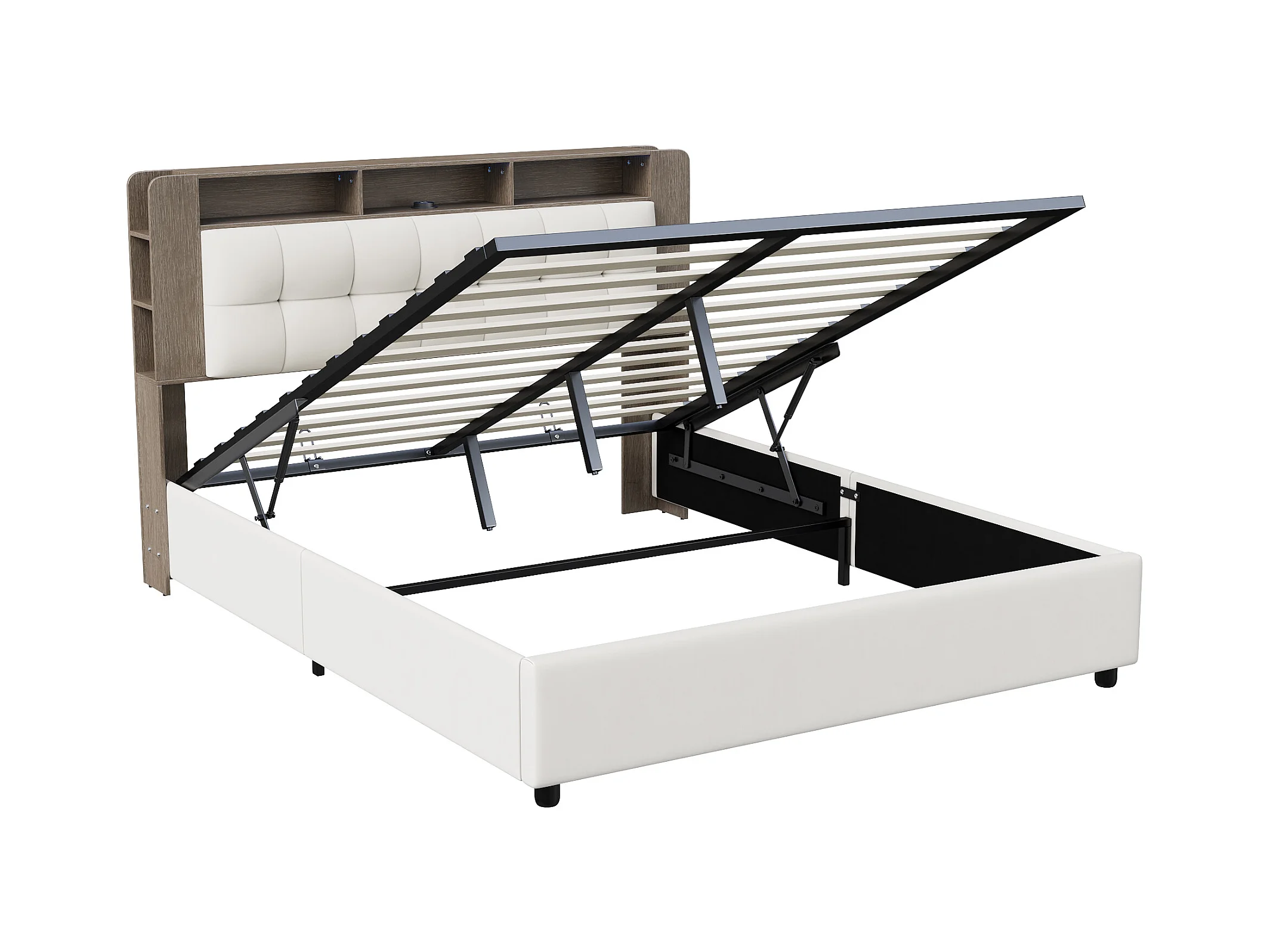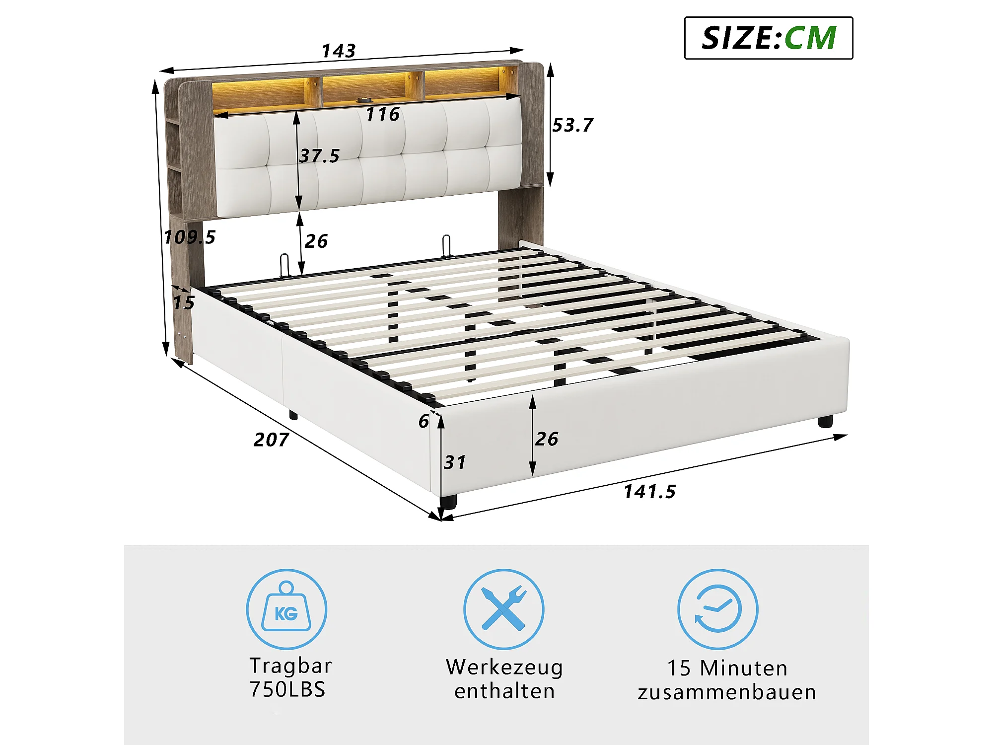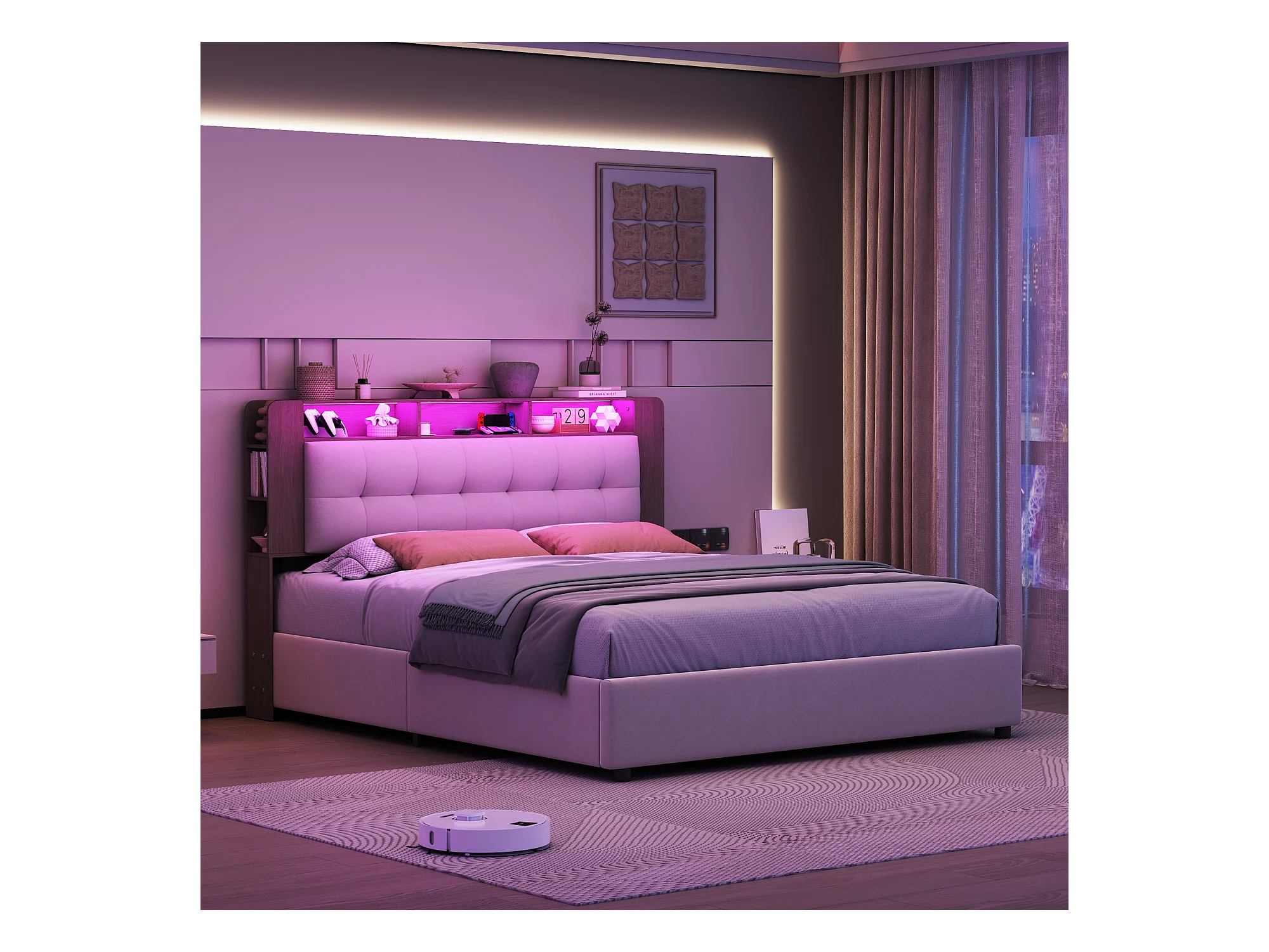 Letto 140x200 cm con rete a doghe e LED, testiera con contenitore, letto matrimoniale con contenitore, beige
