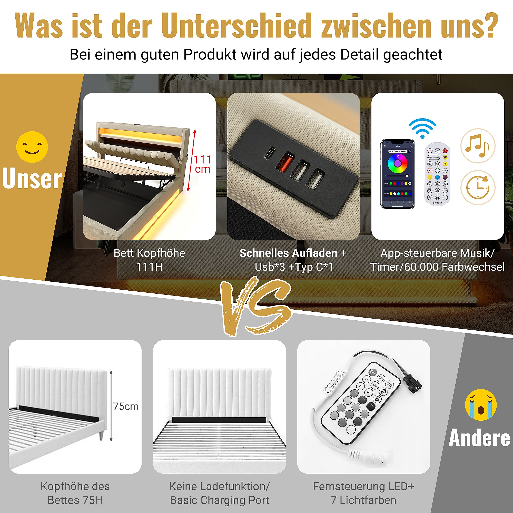 Letto matrimoniale 140×200 cm, beige lino, con contenitore idraulico, LED controllabile tramite APP e porte USB Type-C (senza materasso)