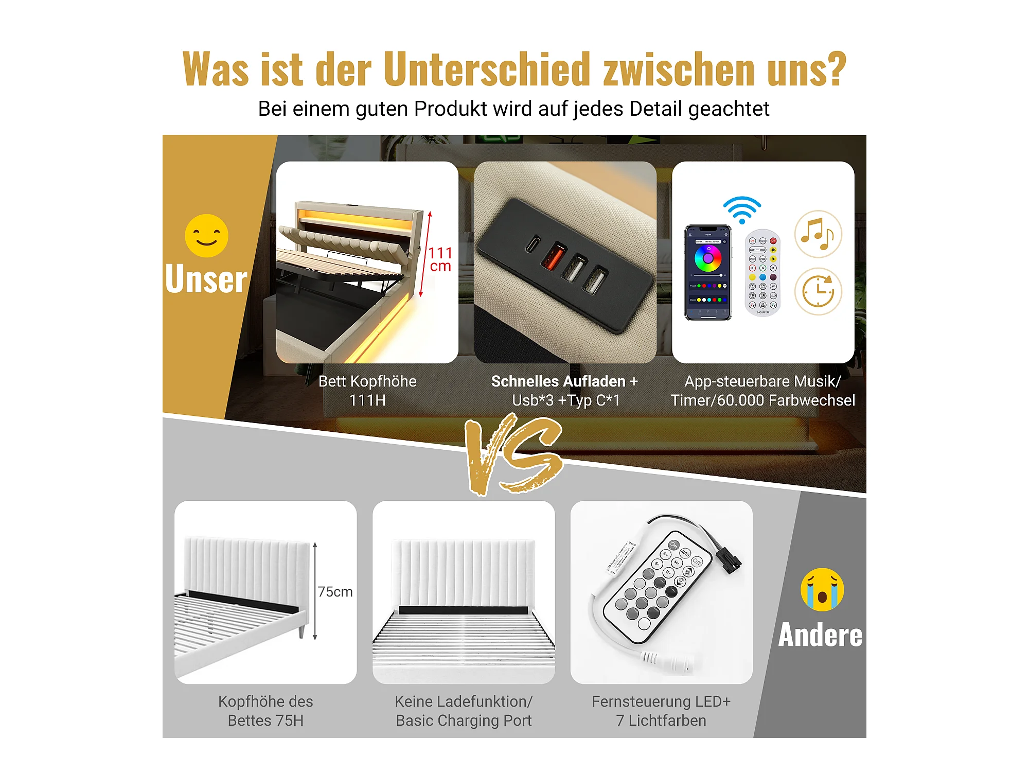 Letto 140x200 cm con testiera contenitore, porte USB e Type-C, illuminazione a LED, con contenitore idraulico, in lino beige (218x142x112 cm)