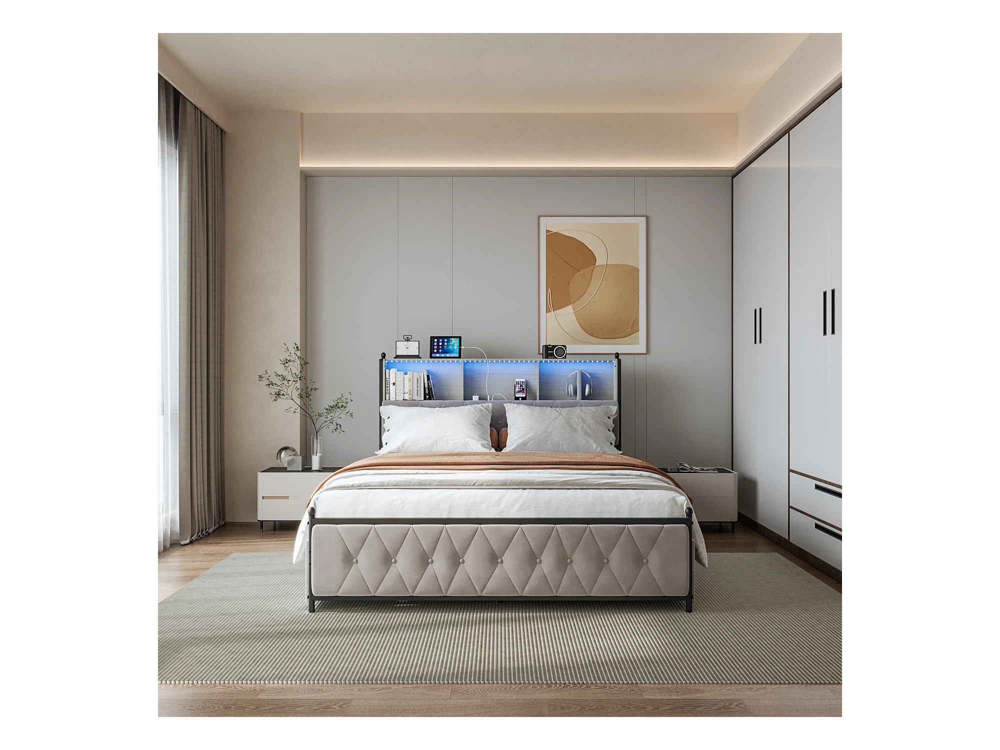 Letto 140x200 cm in velluto beige con cassetti, testiera LED multicolore, USB/Type-C e contenitore sotto il letto