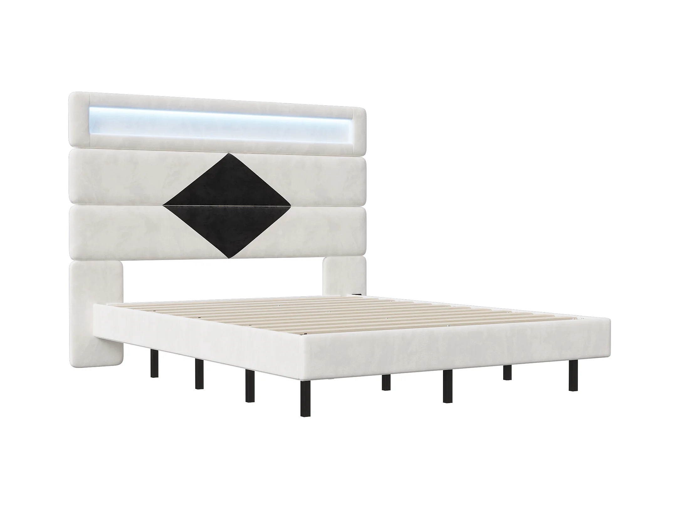 Letto 140x200 cm, Letto sospeso con testiera a diamante, con USB e illuminazione LED, - Bianco