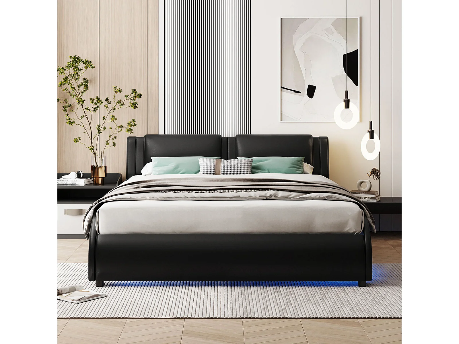 Letto 140x200 con LED e USB, struttura letto matrimoniale sospesa con doghe in legno, PU, nero