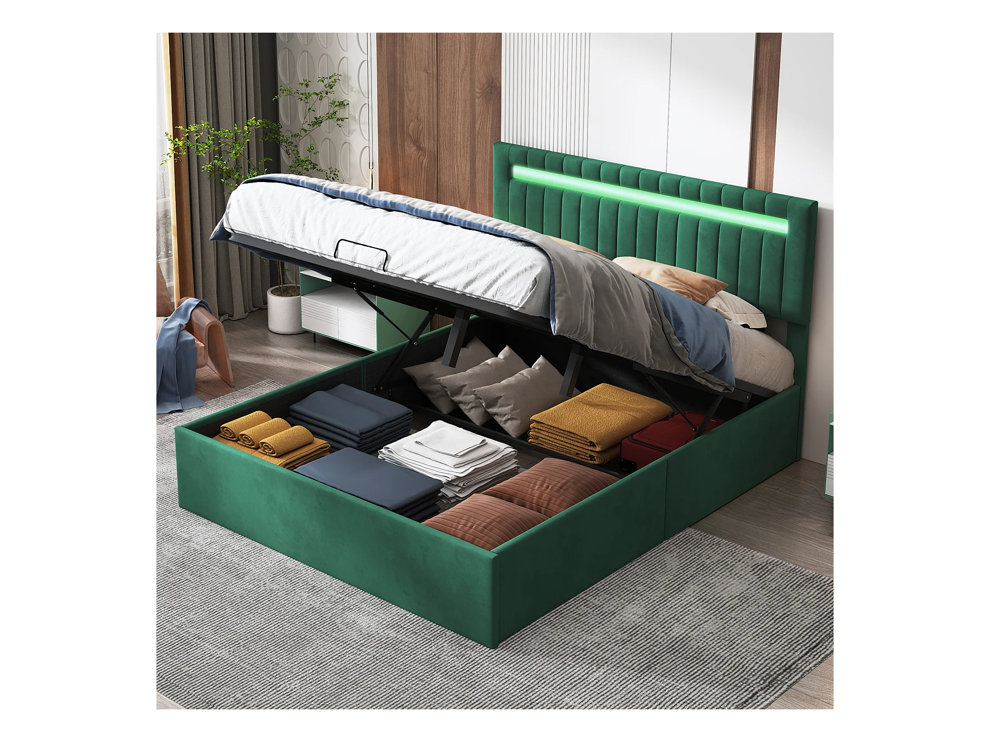 Letto contenitore 140x200cm - Contenitore e illuminazione LED - Rete a doghe - Testiera regolabile - Verde