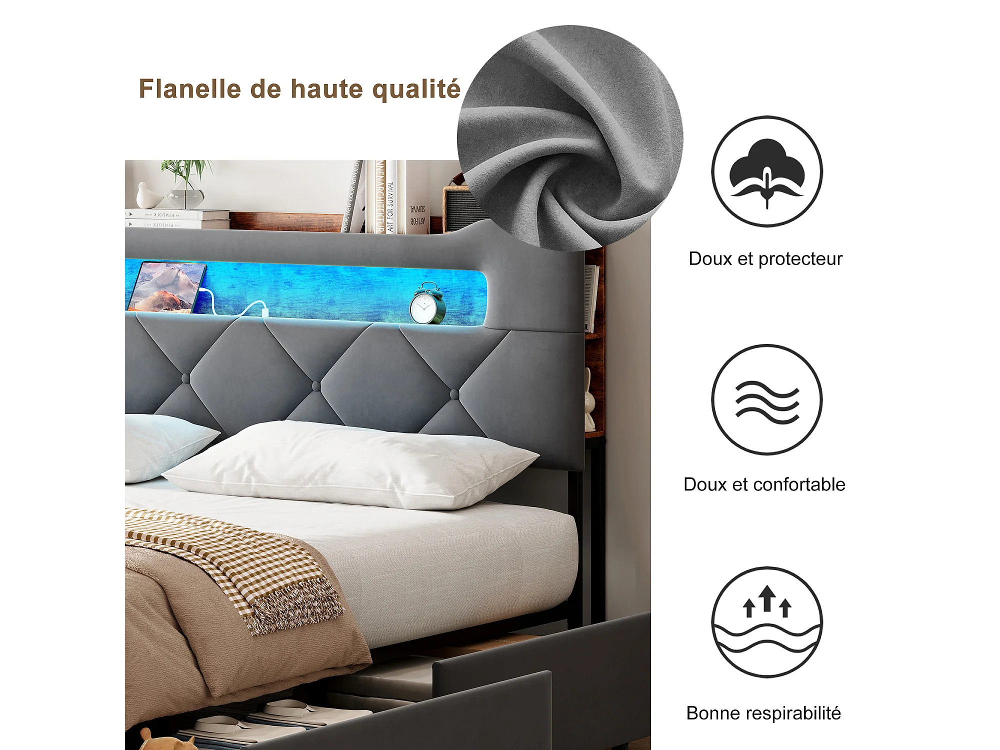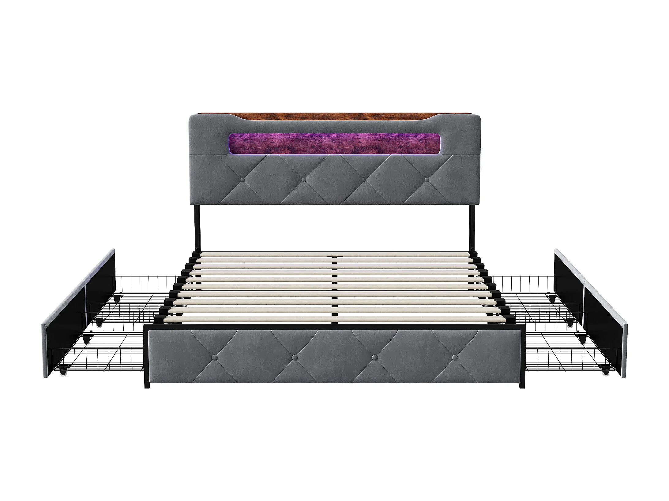 Letto 160x200 cm con 4 cassetti contenitore – Testiera con illuminazione a LED, rivestimento in tessuto grigio, struttura e pannelli in metallo