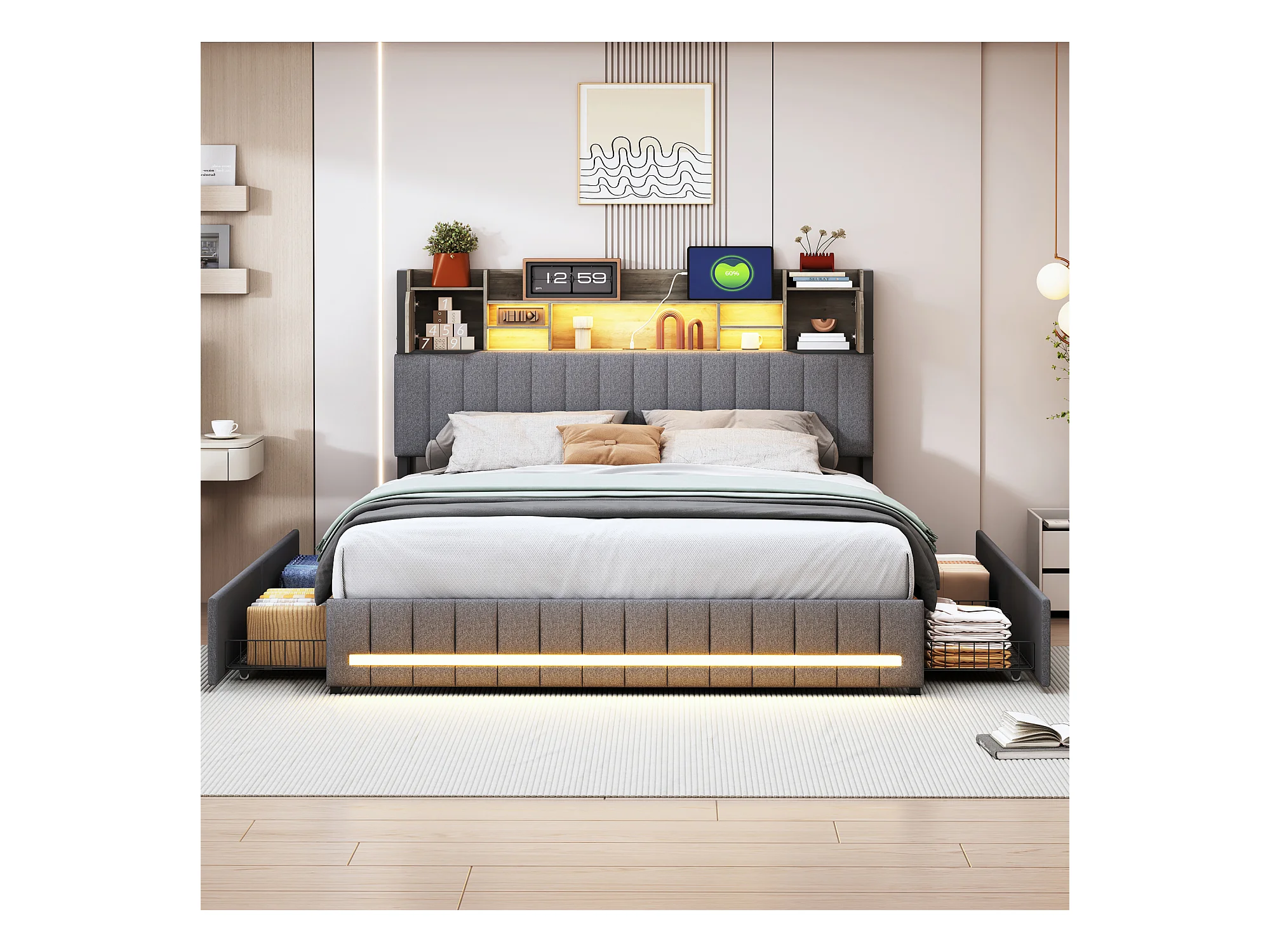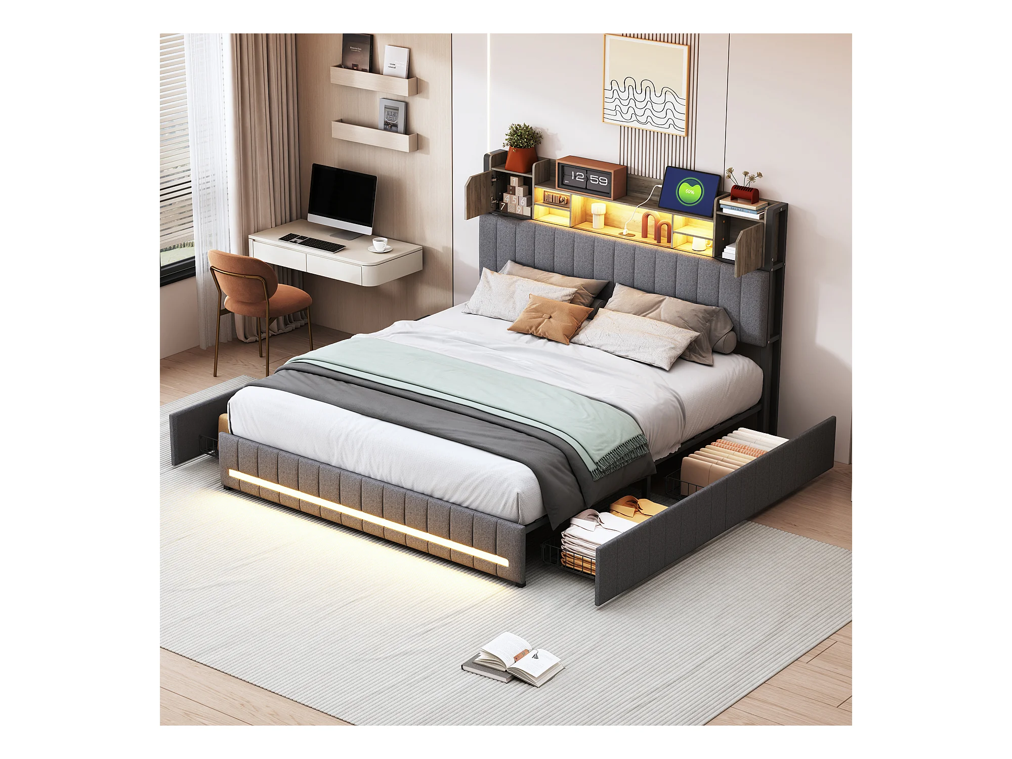 Letto 160x200 con LED e USB, Letto matrimoniale imbottito con rete a doghe e 4 cassetti, Lino, Grigio
