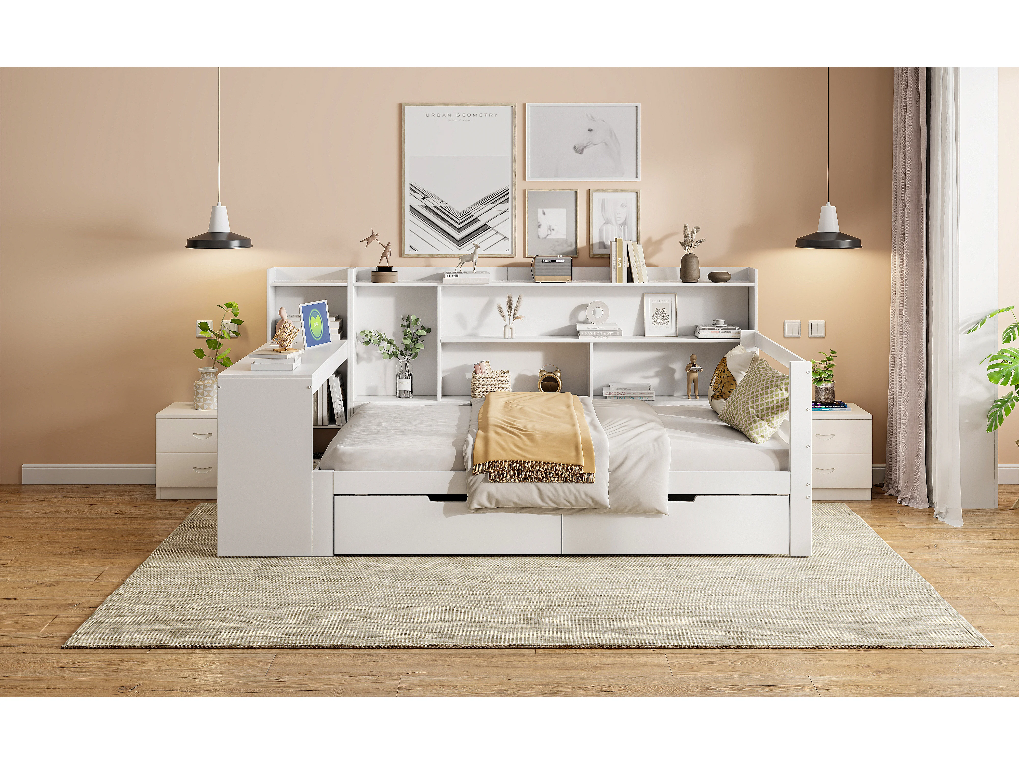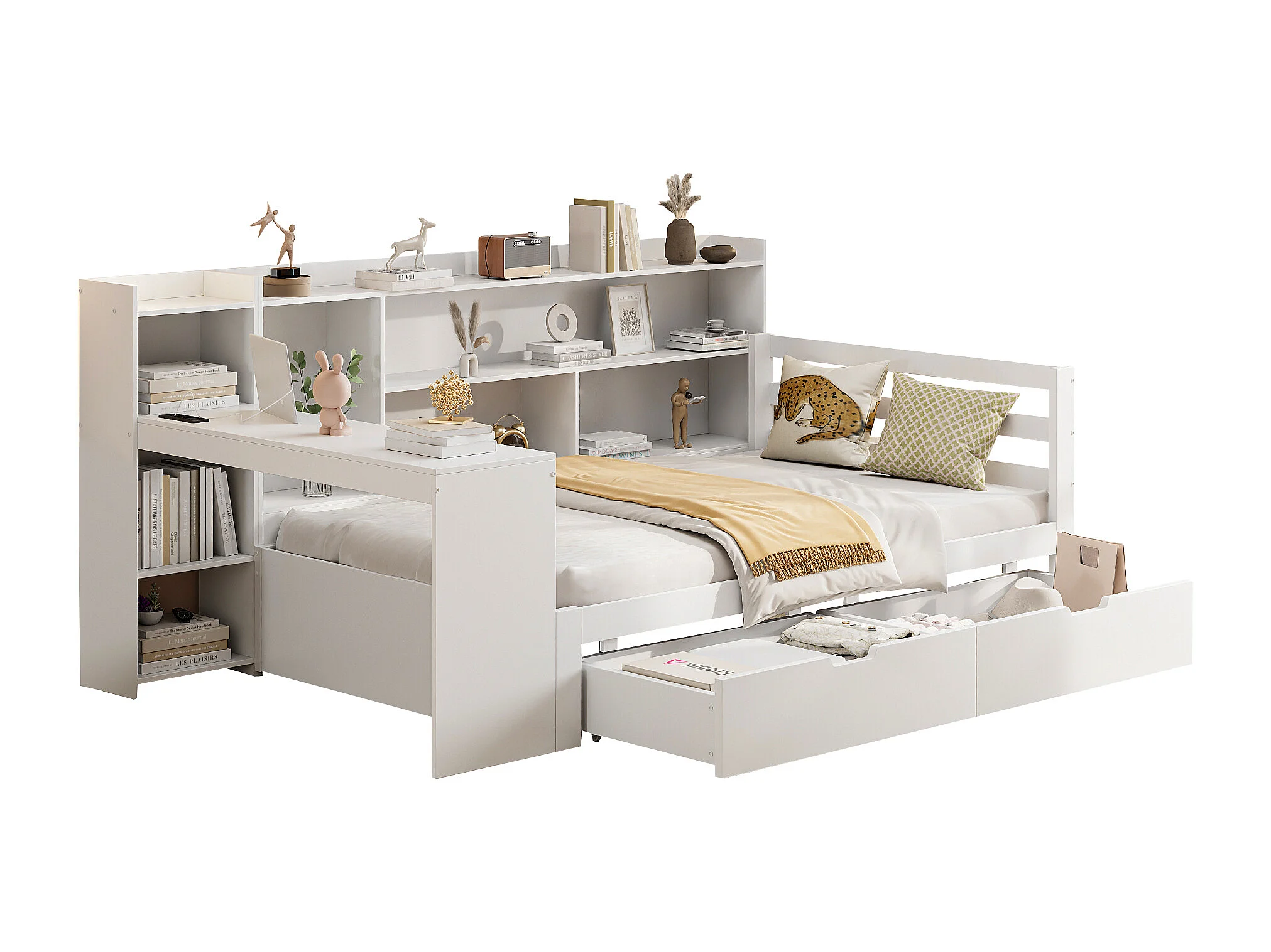 Letto 90 x 200 cm con testiera e 2 cassetti - scrivania, scomparti e prese USB - Pino + compensato + MDF - Bianco