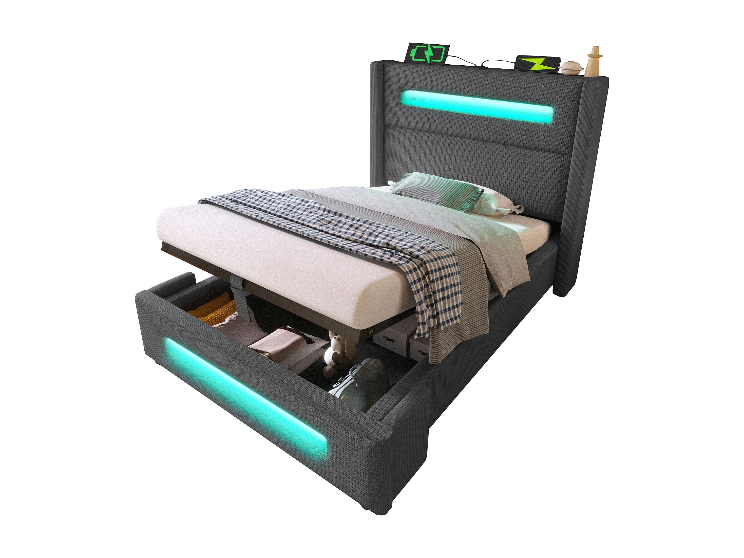 Letto 90x200 cm con LED, vano contenitore idraulico e ricarica USB Type-C, struttura in metallo con doghe in legno, lino grigio (219x105x121 cm)