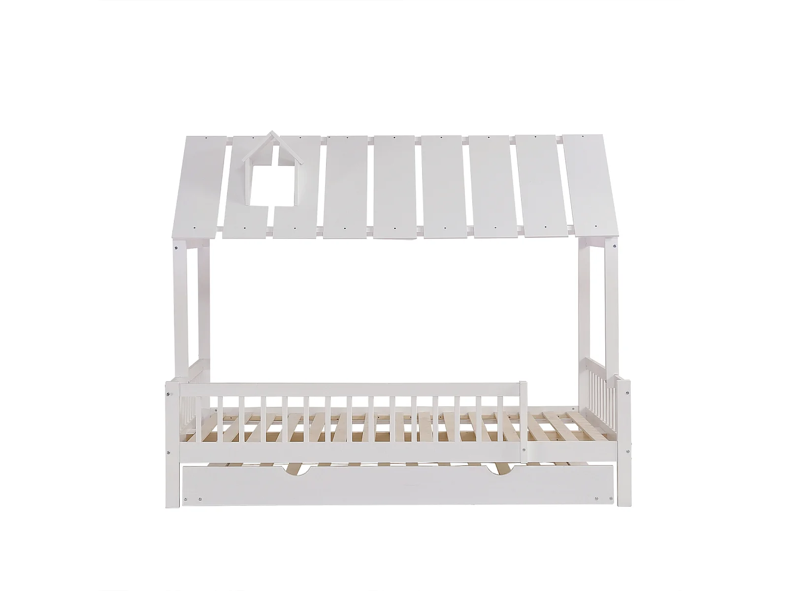 Letto a casetta 120x200cm con letto estraibile 120x190cm, Letto per bambini con tetto, griglia su 3 lati, pino + MDF, Bianco