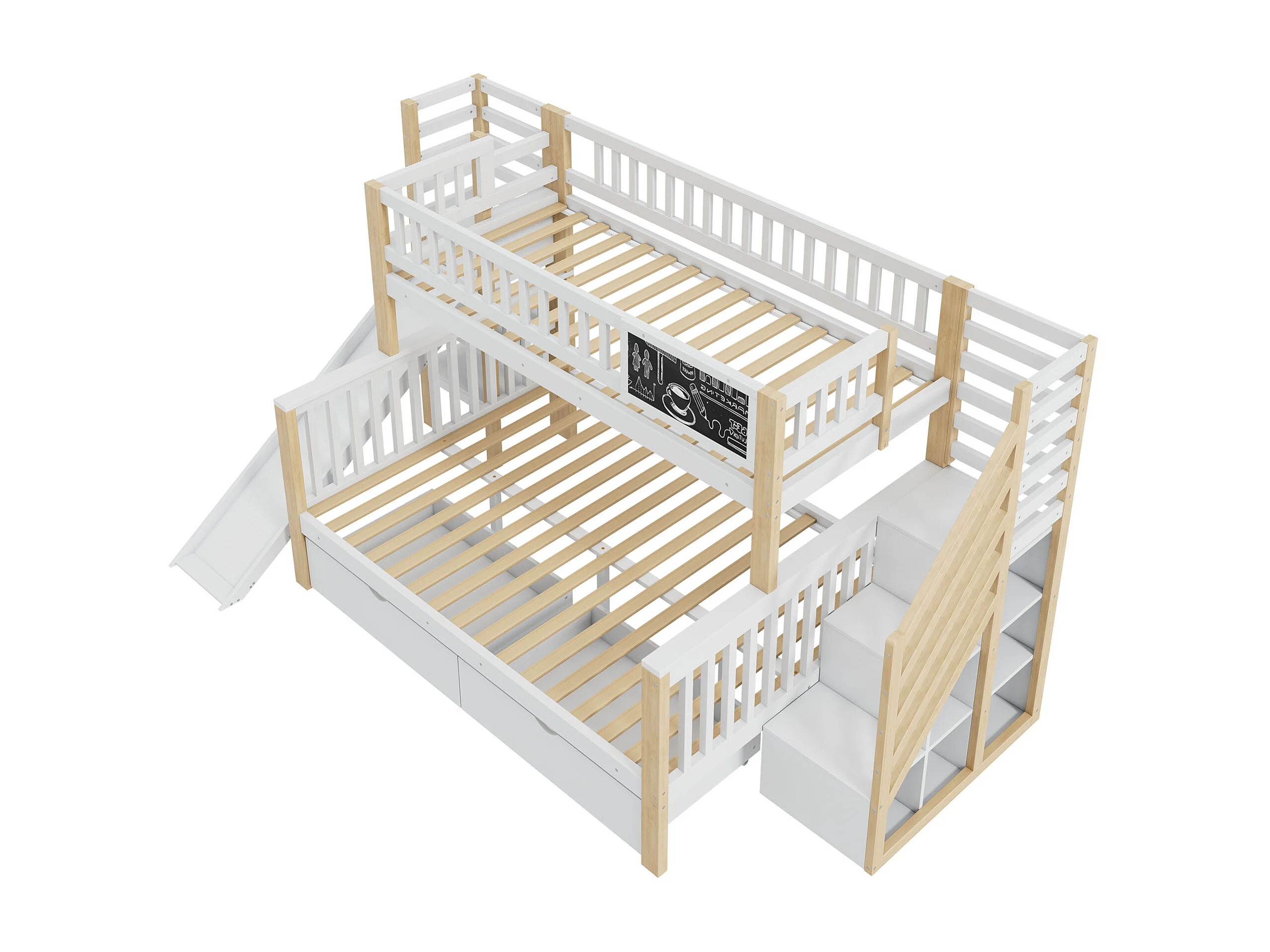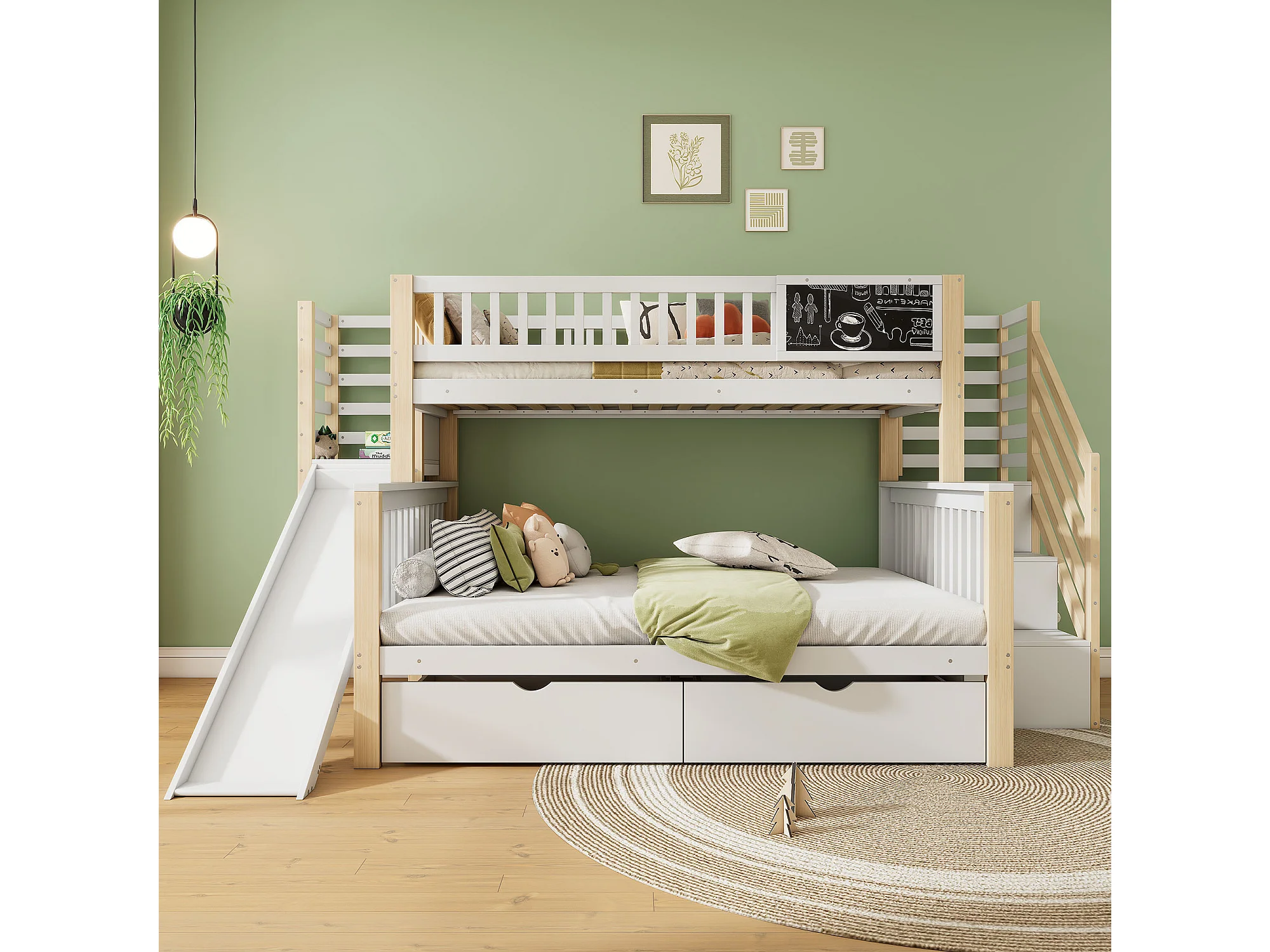 Letto a castello per bambini 140x200 cm con scivolo e scale contenitore, con armadio e lavagna, legno, bianco naturale (Senza materasso)