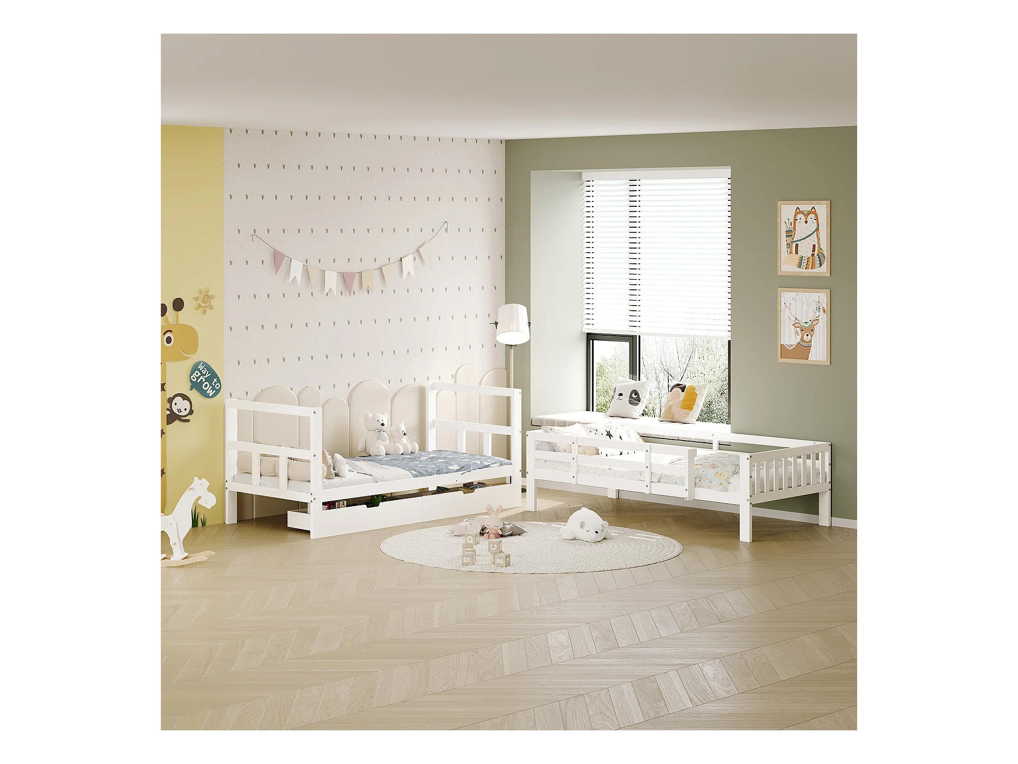 Letto per bambini 90x200 cm imbottito, testiera regolabile, 2 cassetti, forma a corona con LED, stile principessa, bianco (senza materasso)