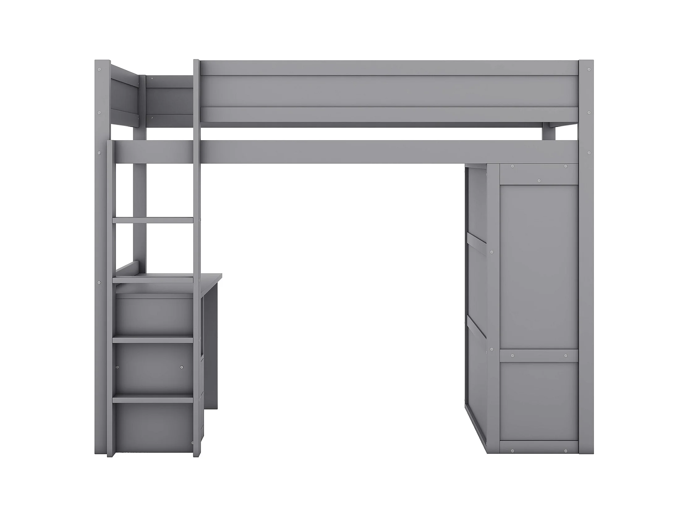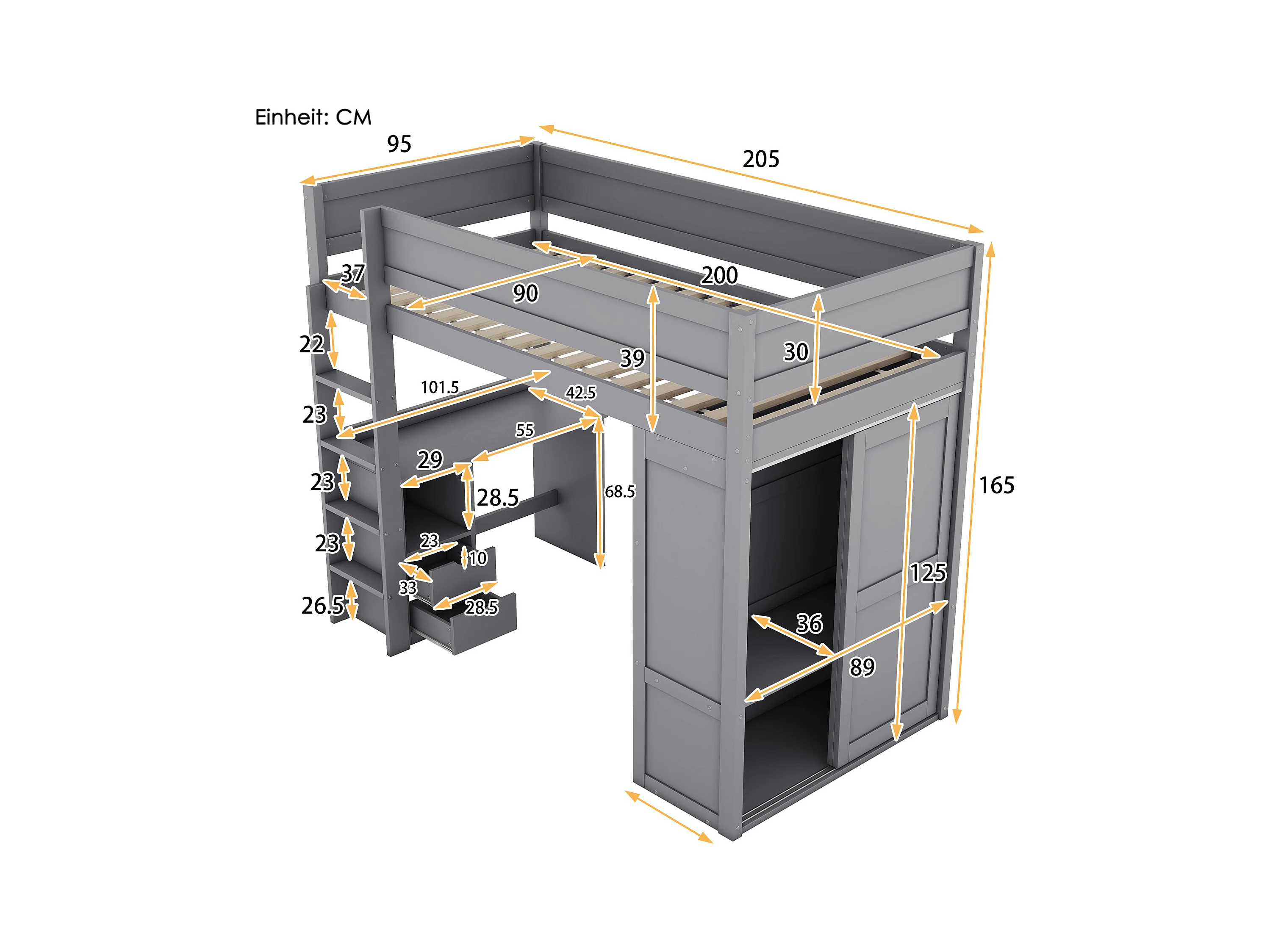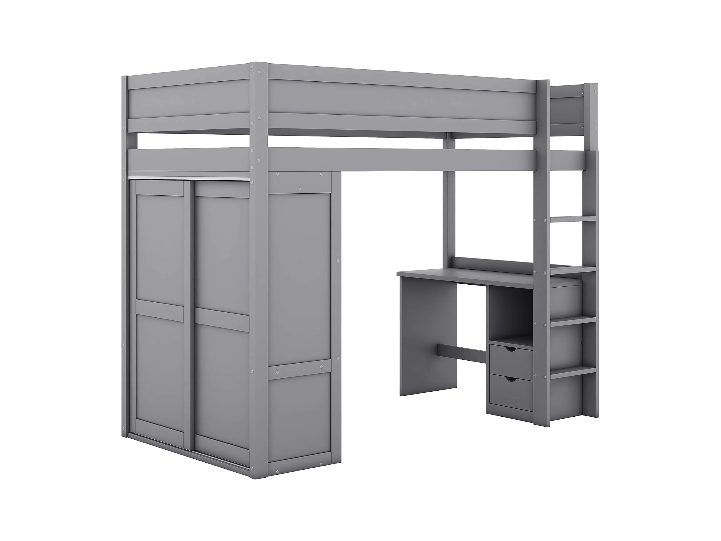 Letto a castello multifunzionale in legno massello 90x200 cm con scala, armadio e ripiani, grigio (205x95x140 cm)