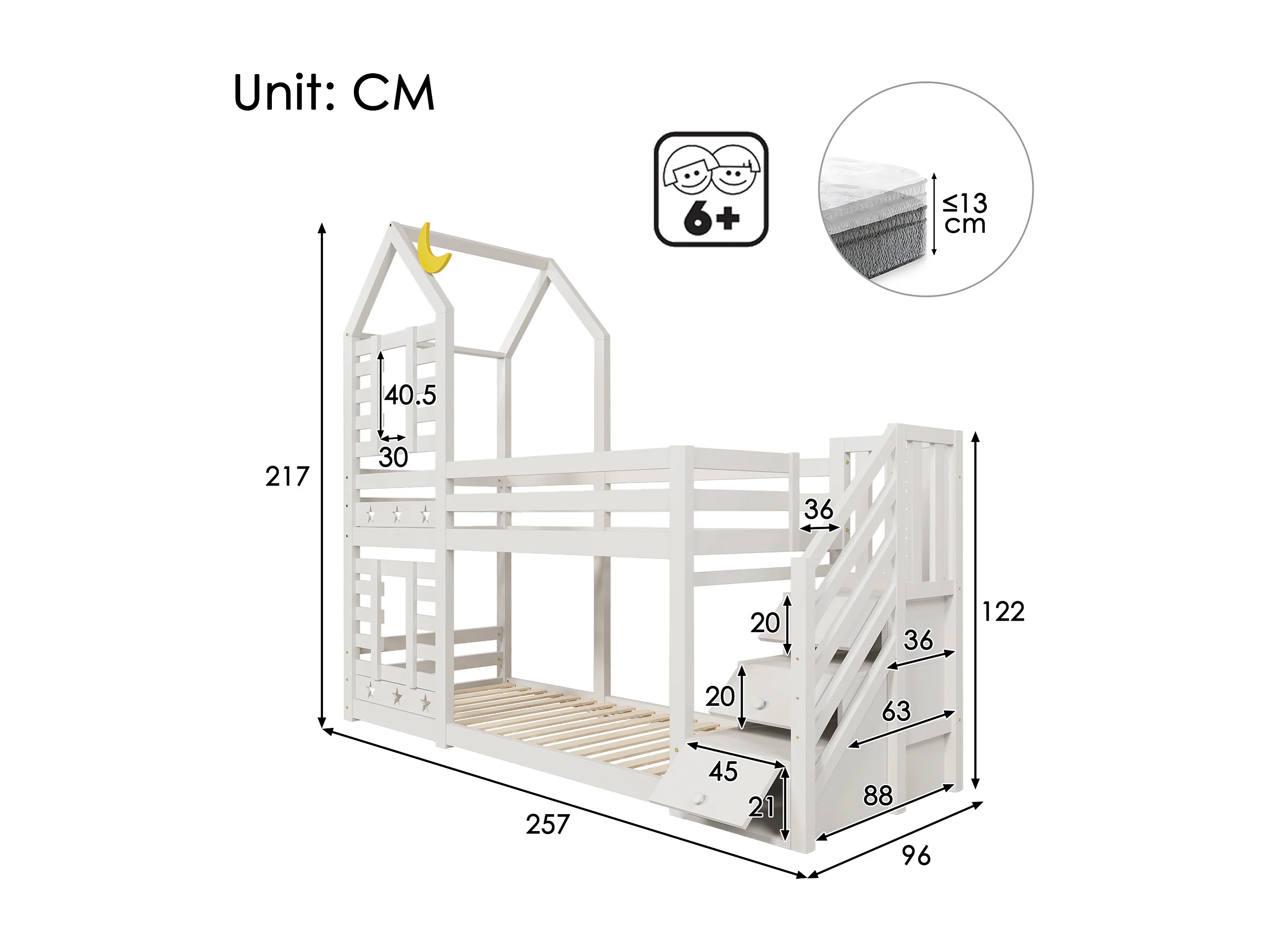 Letto a castello 90x200 cm - con sponda e cassetto - bianco - senza materasso