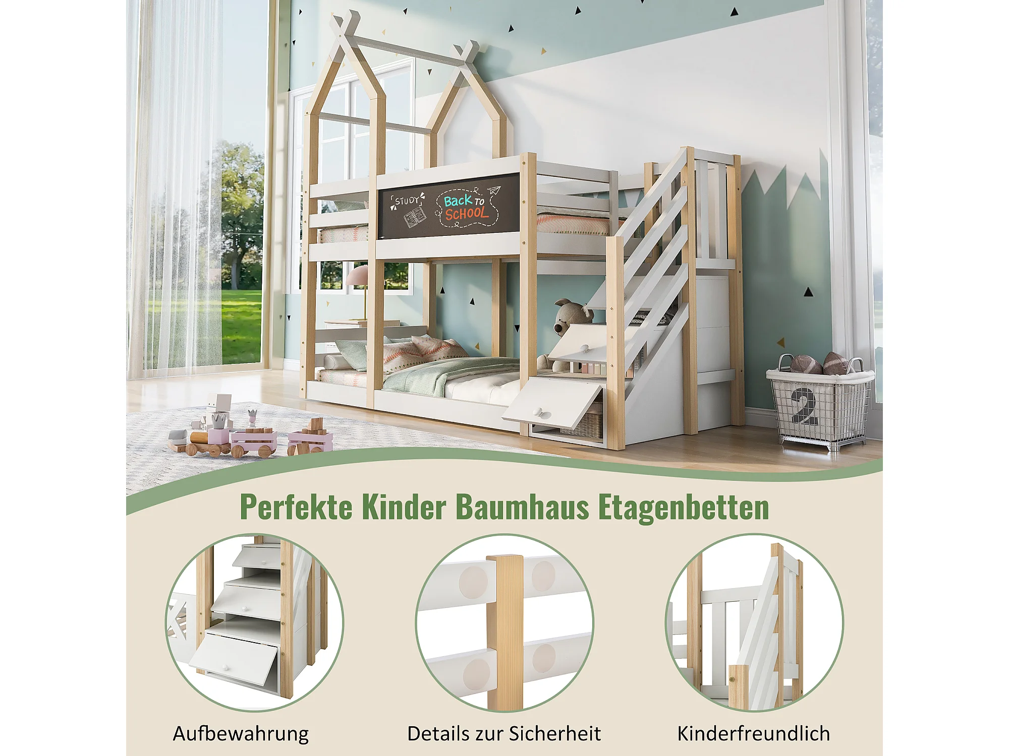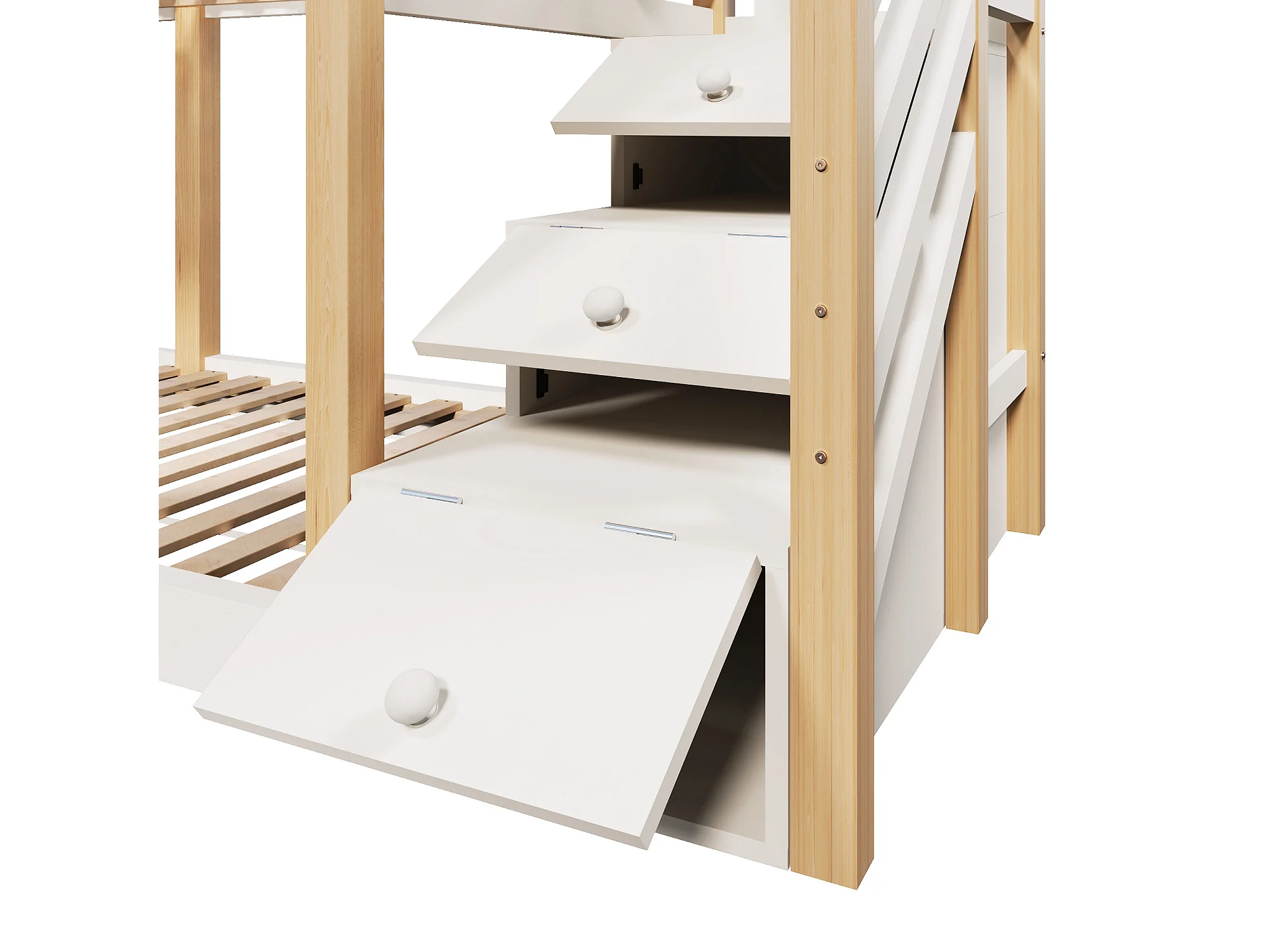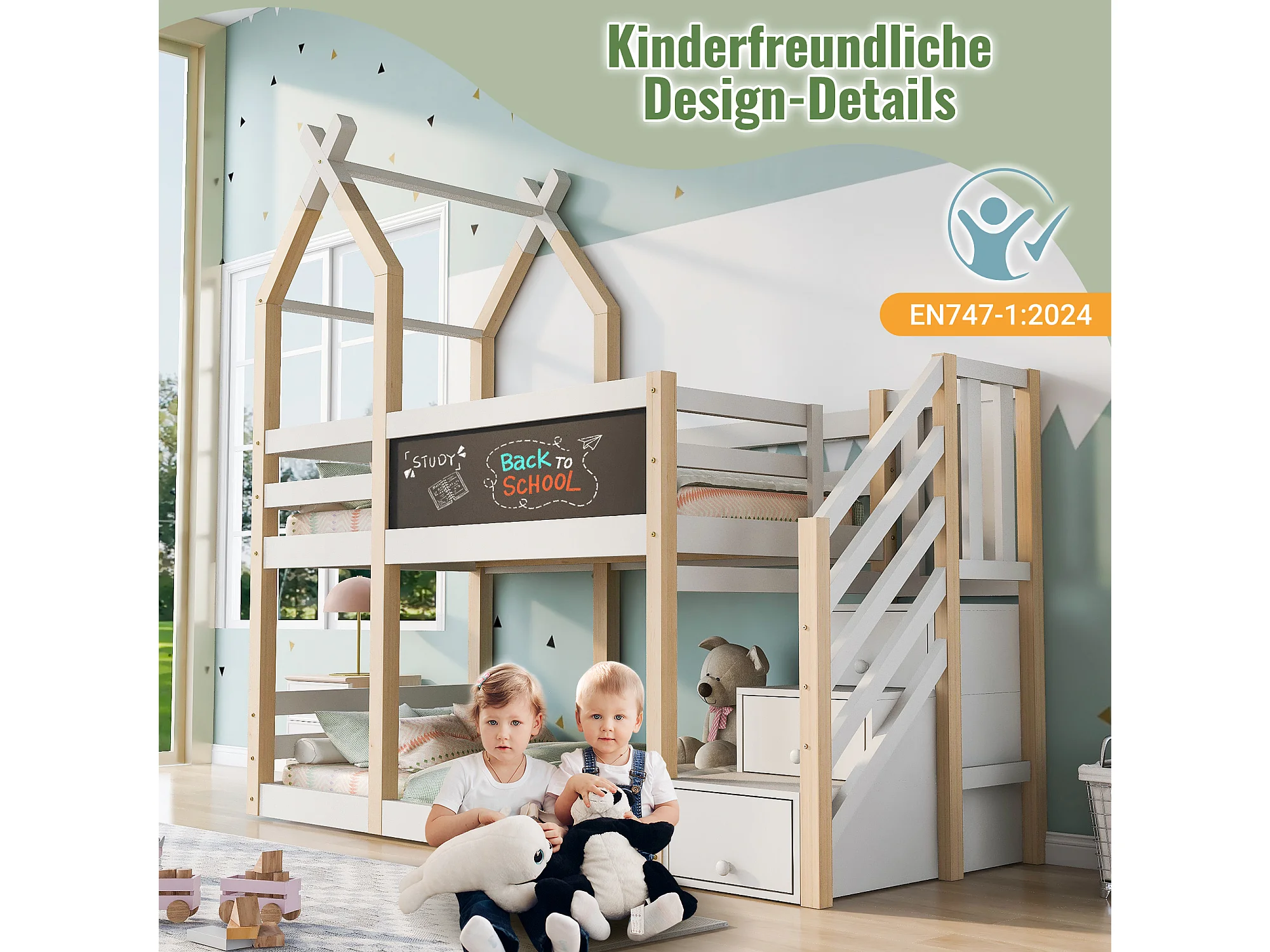 Letto a castello per bambini 90x200 cm, letto a forma di casa con contenitore e protezione anticaduta, naturale e bianco, con tavolo (256x96x192 cm)