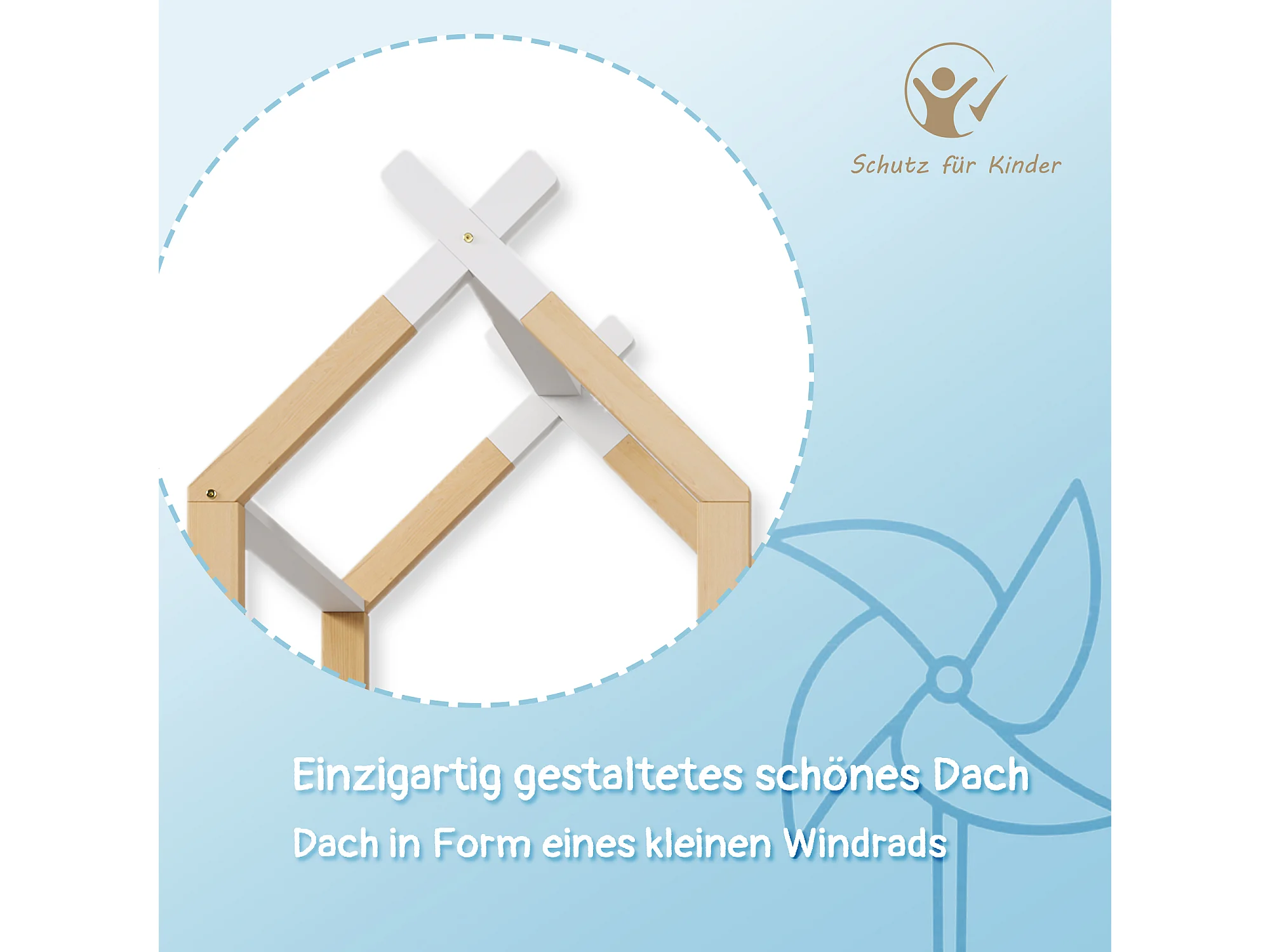 Letto a castello per bambini con contenitore, tetto e finestre, in legno massello e MDF, bianco e naturale, 90x200 cm
